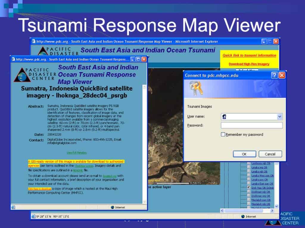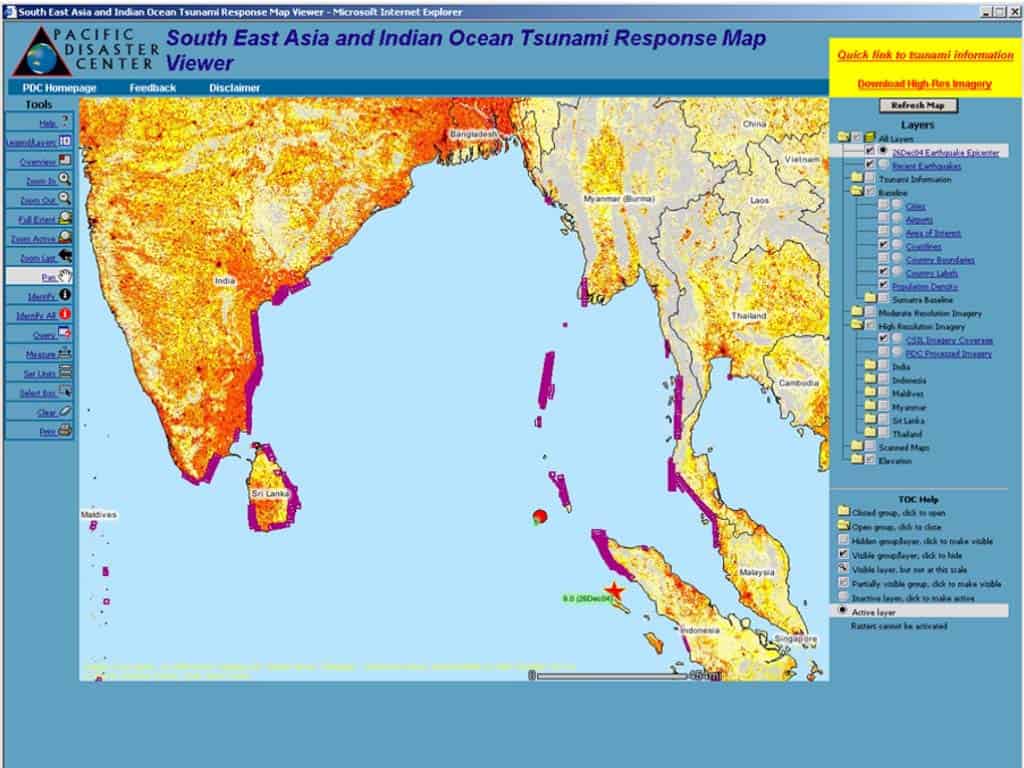 Shown below is the earliest iteration of PDC’s DisasterAWARE utilized for hazard warnings, search and rescue, and damage and needs assessments following the 2004 Indian Ocean Tsunami. The system also helped agencies collaborate and share information to better inform humanitarian relief efforts across multiple countries.