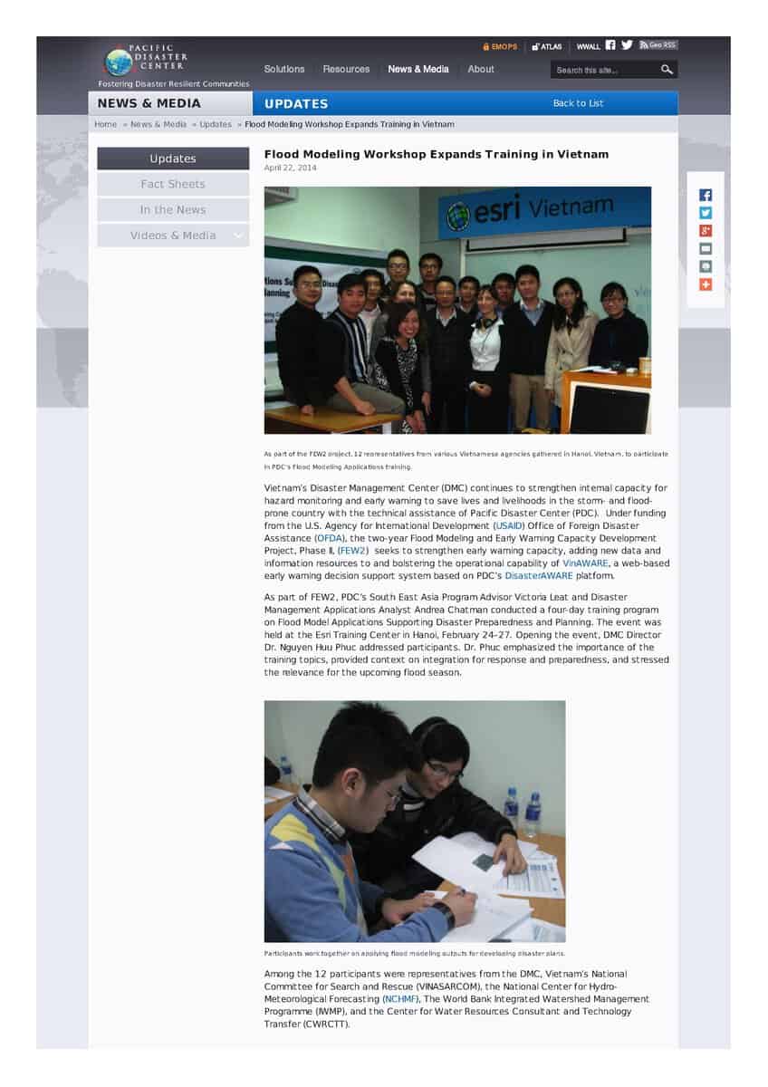This event is part of a series of training sessions developed under FEW2 to enhance Vietnam’s disaster management capacity. In December 2013, 10 participants received training on the MIKE 11/21 flood modeling applications; in early January of this year, nine people received training and certification to become VinAWARE Train-the-Trainers;  and in late January, 74 national- and provincial-level disaster managers received VinAWARE training to build capacity to use the VinAWARE system. Additional planned training sessions include U.S. Army Corps of Engineers (USACE) Dam Safety Program training scheduled for May and further VinAWARE user and administrator training planned for later in 2014. In addition to this training, PDC is also working closely with DMC to incorporate additional national data into the VinAWARE system and institutionalize the use of the system to improve the country’s disaster management early warning and decision making.