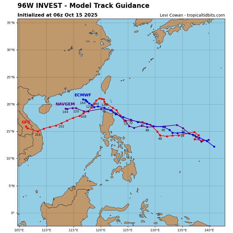 Global models are in fair agreement that invest 96W will have steady development over the next 24-48 hours while tracking northwestward. All