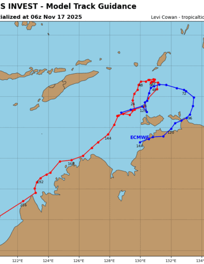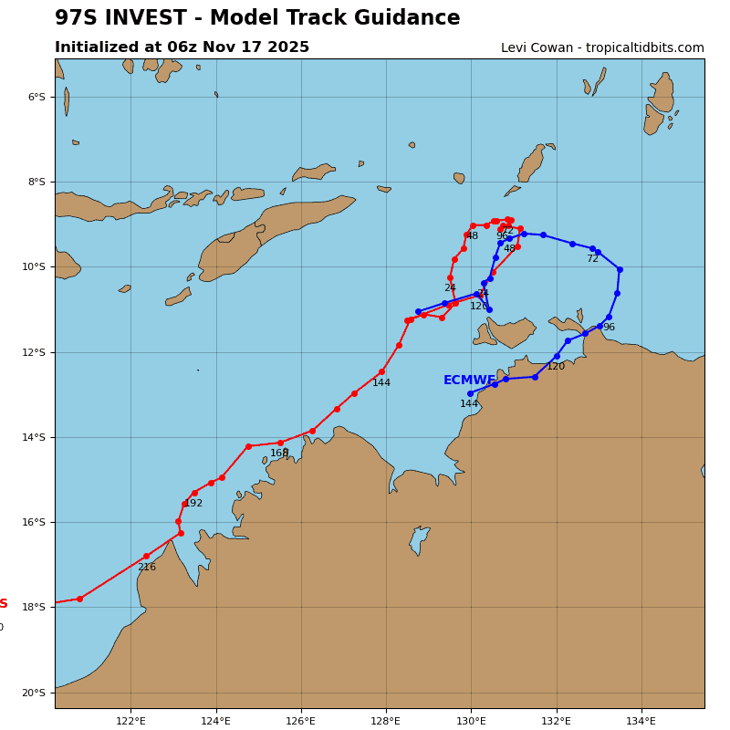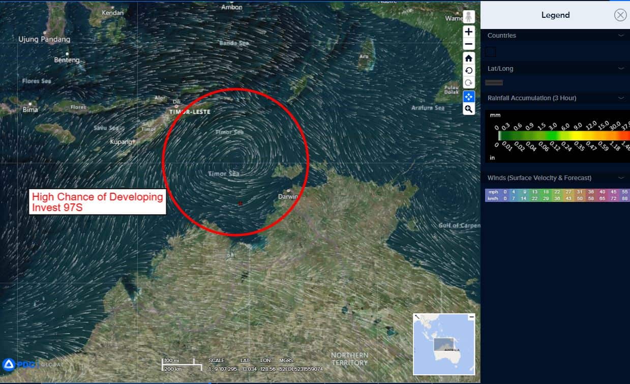 >>> There’s an area of disturbed weather being referred to as Invest 97S, which is located approximately 131 NM north-northwest of Darwin, Australia