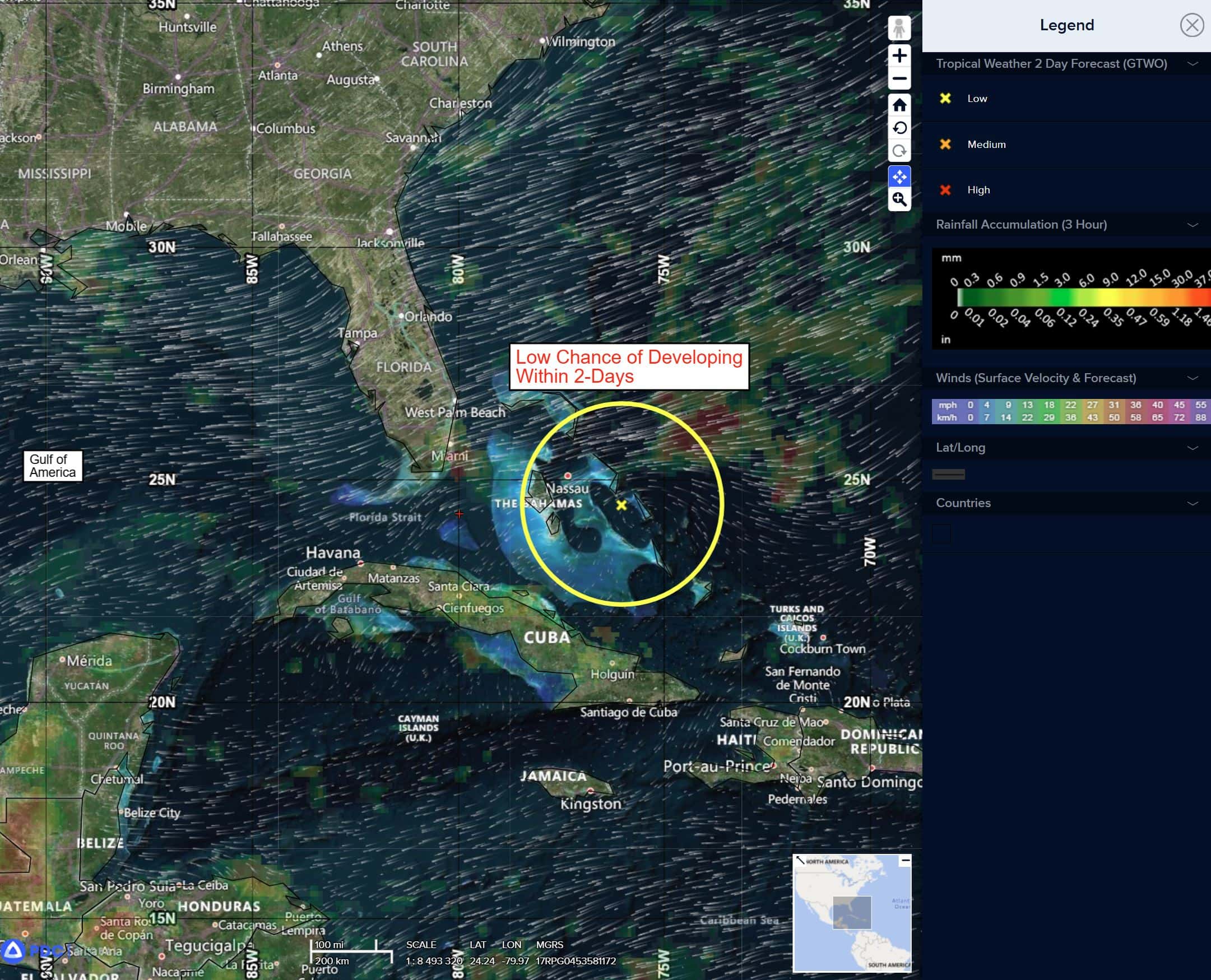 >>> A weak area of low pressure has formed near the central Bahamas along the remnants of a frontal boundary. This system is expected to meander near Florida and the Bahamas for the next several days.