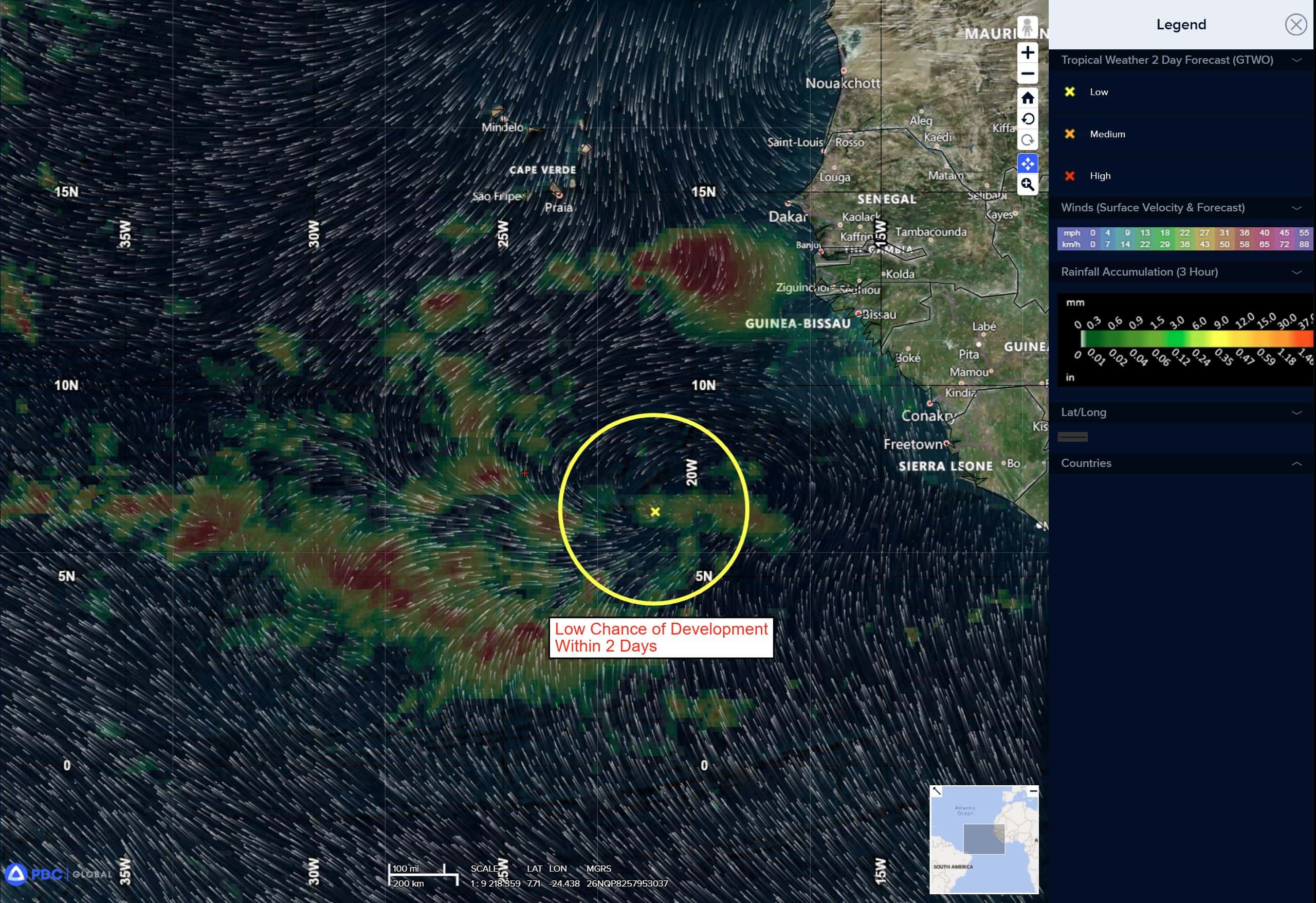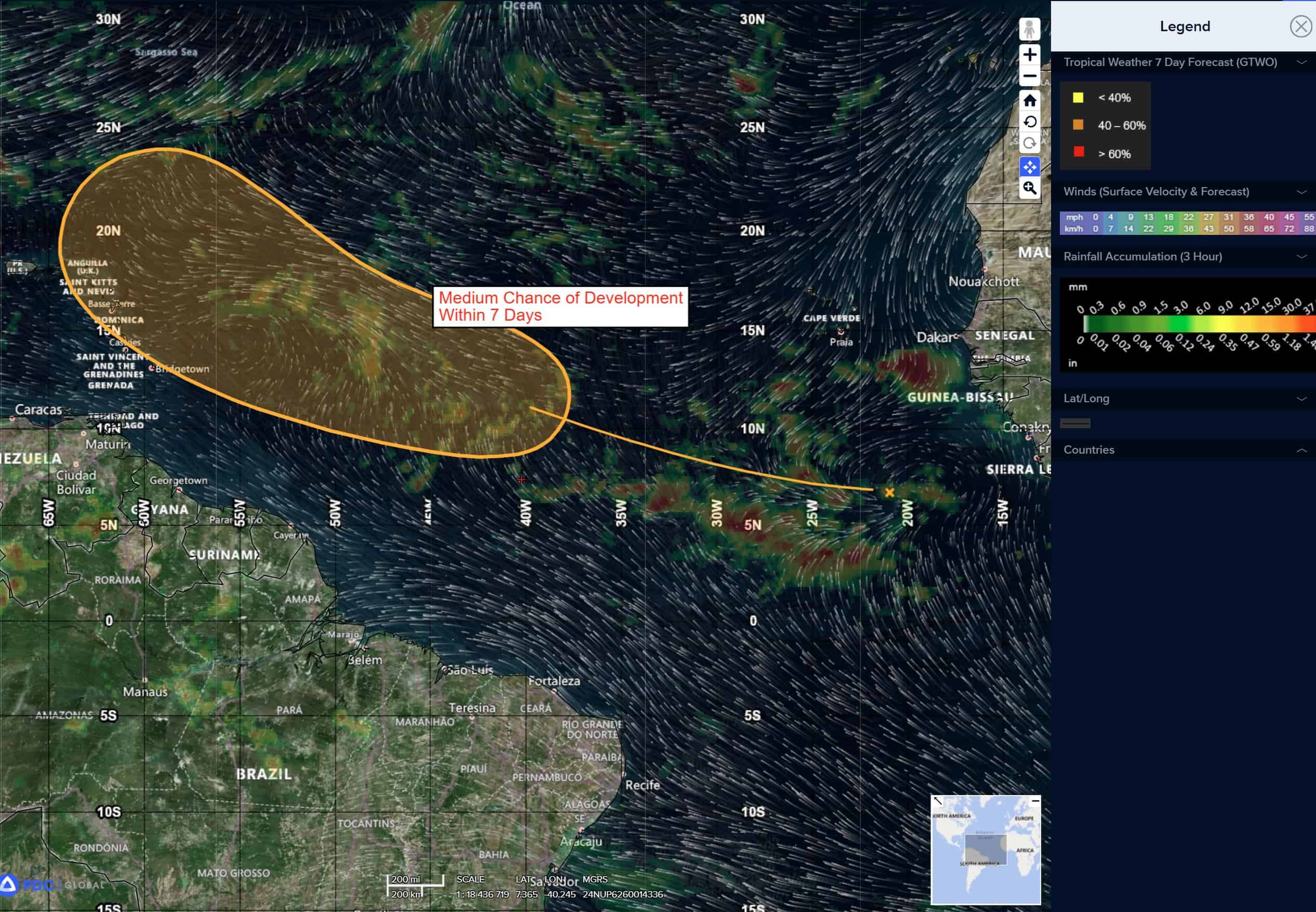 >>> A broad area of low pressure is producing disorganized showers and thunderstorms several hundred miles south of the Cabo Verde Islands. Environmental conditions appear conducive for gradual development of this system, and it could become a tropical depression by the middle to latter part of this week while moving across the central tropical Atlantic and approaching portions of the Leeward Islands.