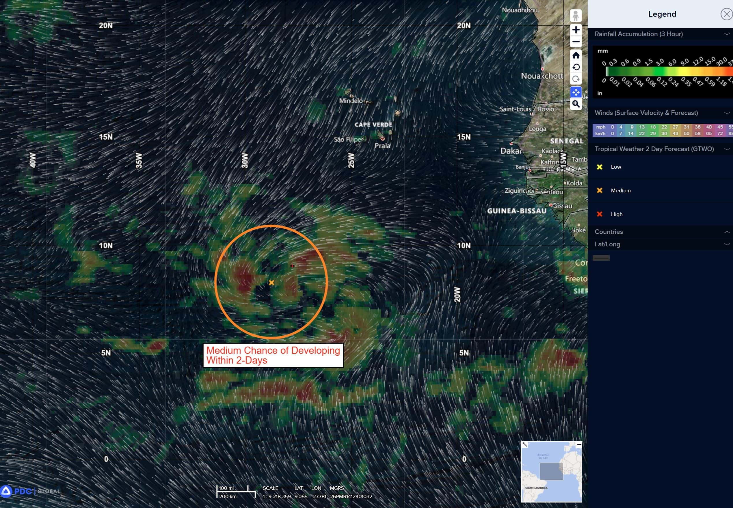 >>>  A broad area of low pressure associated with a tropical wave continues to produce a large area of disorganized showers and thunderstorms several hundred miles south-southwest of the Cabo Verde Islands.