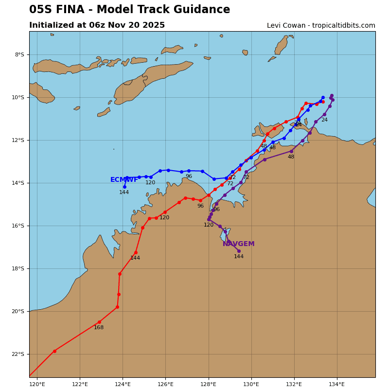 An initial landfall is forecast to occur around 24 hours, near the Garig Gunak Barlu national park. The system will then cross the Van Diemen Gulf with a second landfall near Darwin as 05S skirts the coast. 05S is then expected to enter the northern portion of the Bonaparte Gulf near 72 hours before making a third landfall east of Kalumburu near 96 hours.