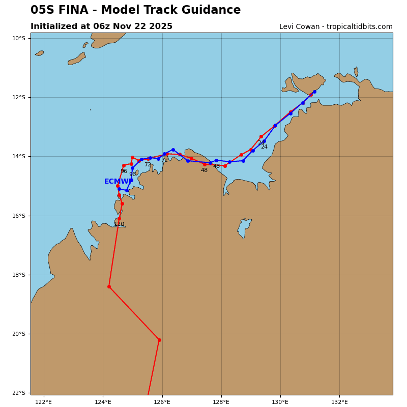 The western extension of the str is forecast to weaken with the approach of a major shortwave trough, which will allow TC 05S to track southwestward through 36 hours over the Joseph Bonaparte Gulf. After tracking away from Melville Island, TC Fina is forecast to briefly re-intensify through 12 hours under favorable conditions to a peak intensity of 95 knots.