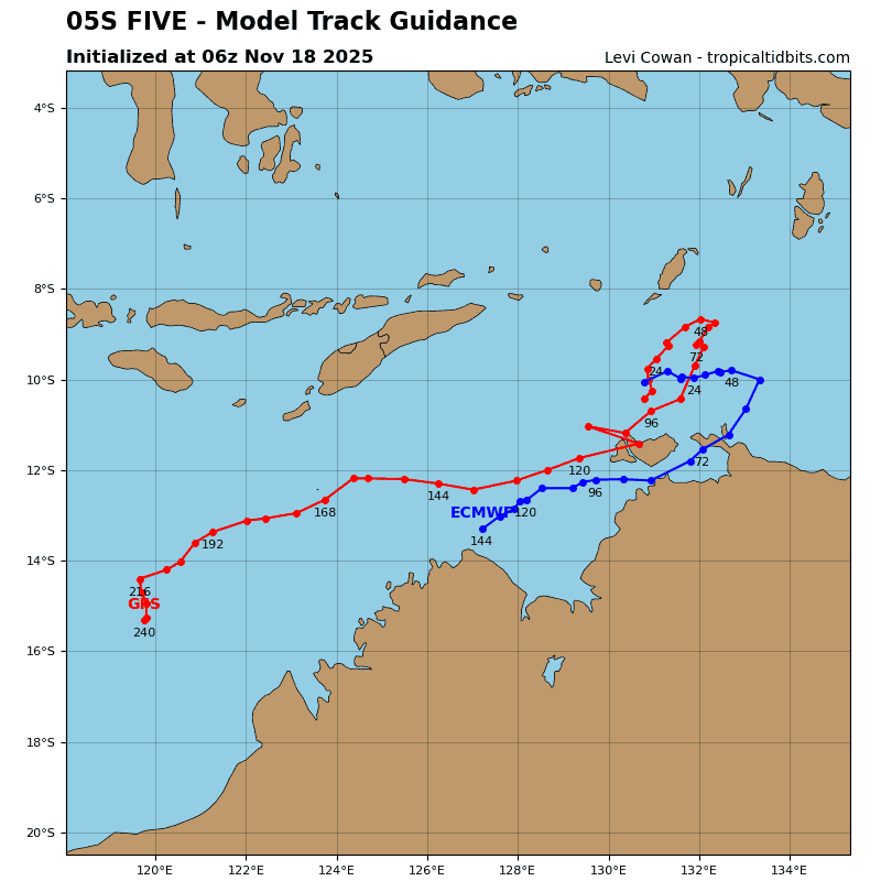 This will drive the system southwestward to west-southwestward through 120 hours. After 72 hours, TC 05S will skirt the northern coast of Australia, with no change to the intensity through 96 hours. After 96 hours, the system will track back over water with a slight intensification to 50 knots by 120 hours.