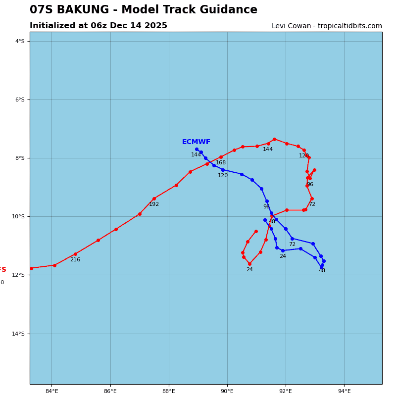 Over the next 12 hours or so, TC 07S will drift slowly towards the southwest under the influence of the rapidly weakening ridge to the east. The system reaches an inflection point by 12 hours and will be pushed eastward by the combined influence of the trof passing far to the south and a strengthening ner situated along the equator from Sumatra all the way to the Maldives. TC 07S will track eastward along the southern side of the ner through 48 hours, before it once again reaches an inflection point as the ner to the north begins to recede westward, while simultaneously a subtropical ridge (str) builds northwestward from western Australia and literally pushes TC 07S slowly northward.