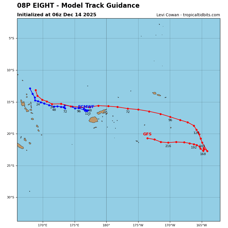 Tropical cyclone (TC) 08P (eight) has tracked southeastward along the western side of a deep-layer, east-west oriented ner, centered near western Samoa, for the past day or so. This general motion is expected to continue for the next 12-18 hours before the system gradually turns onto a more eastward trajectory as the ridge moves north and elongates towards the west. TC 08P will track east along the southern side of this ridge through 96 hours, and then as it weakens and comes under the influence of the lower-level steering flow, turns southeastward by the end of the forecast period.