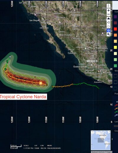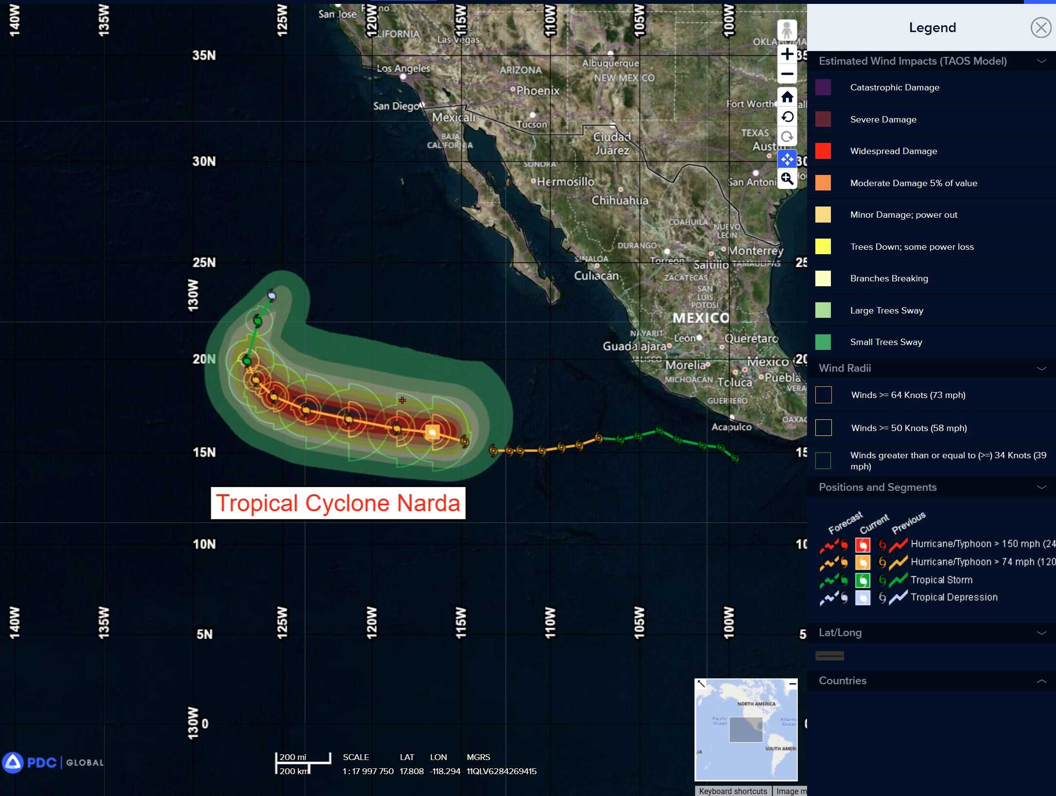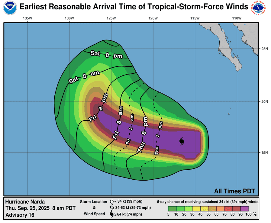 Narda is moving toward the west-northwest near 15 mph (24 km/h), and this general motion is expected to continue for the next couple of days. A northwestward motion is forecast to commence over the weekend, followed by a turn toward the north-northeast early next week. Maximum sustained winds are near 90 mph (150 km/h) with higher gusts. Some restrengthening is forecast and Narda could once again become a category 2 hurricane by Friday. Hurricane-force winds extend outward up to 45 miles (75 km) from the center and tropical-storm-force winds extend outward up to 150 miles (240 km). The estimated minimum central pressure is 980 mb (28.94 inches).