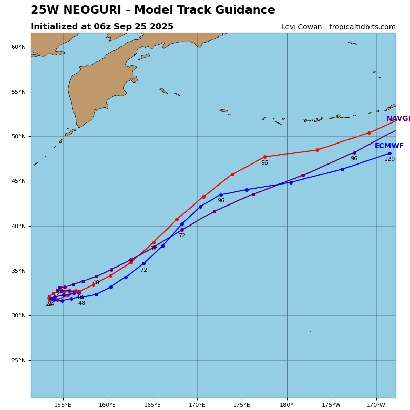 Regarding intensity, 25W is forecast to slightly weaken between 12-24 hours to 55 knots. Intensity is forecast to increase to 60-70 knots as 25W moves northeastward during ett and poleward outflow becomes more robust in response to interaction with the jet stream.
