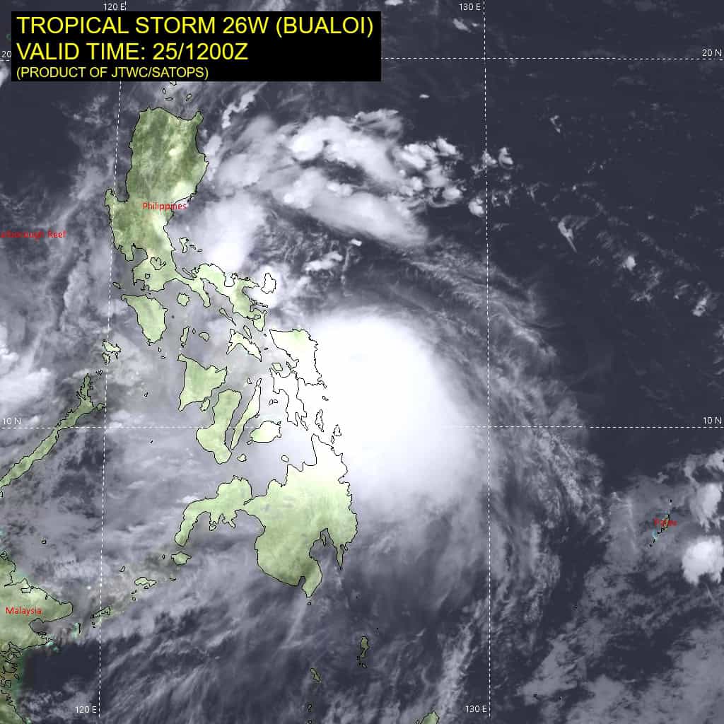 Animated enhanced infrared (eir) satellite imagery depicts tropical storm 26W (Bualoi) with an expansive central dense overcast obscuring the low-level circulation center (llcc) and cloud tops measuring -90 c in multiple areas of the overshooting tops. A 251044z gmi 89 ghz microwave image revealed the low-level clouds tightly wrapping into the northern portion of the circulation and a vigorous burst of deep convection just to the south of the assessed center.