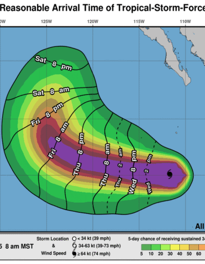 After a quasi-stationary period, a sharp turn to the northwest will occur after 48 hours as the deep layer jet enhances the track speed along the northern periphery of the subtropical ridge to the east. Due to the complexity of the steering environment, it is possible that erratic jagged or looping track motion may occur and is not captured within the warning graphic.