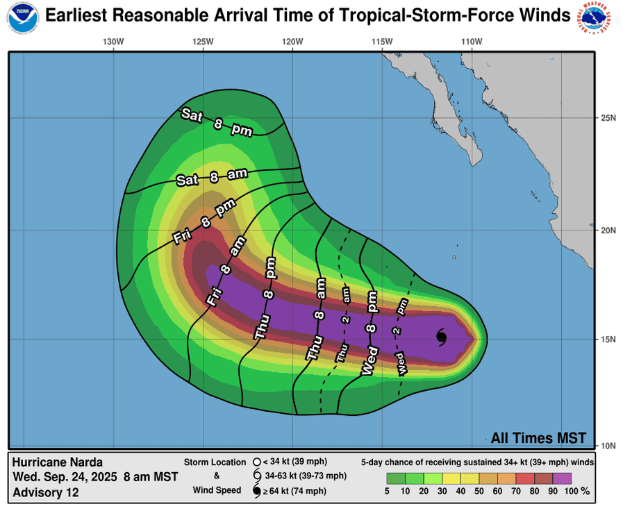 Narda is moving toward the west near 13 mph (20 km/h), and this general motion is expected to continue during the next couple of days. Maximum sustained winds remain near 105 mph (165 km/h) with higher gusts. Some slight weakening is expected through tonight, followed by some restrengthening Thursday night and Friday. Hurricane-force winds extend outward up to 25 miles (35 km) from the center and tropical-storm-force winds extend outward up to 115 miles (185 km). The estimated minimum central pressure is 972 mb (28.71 inches).