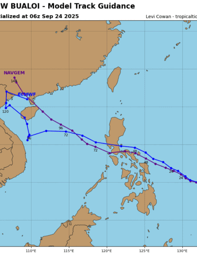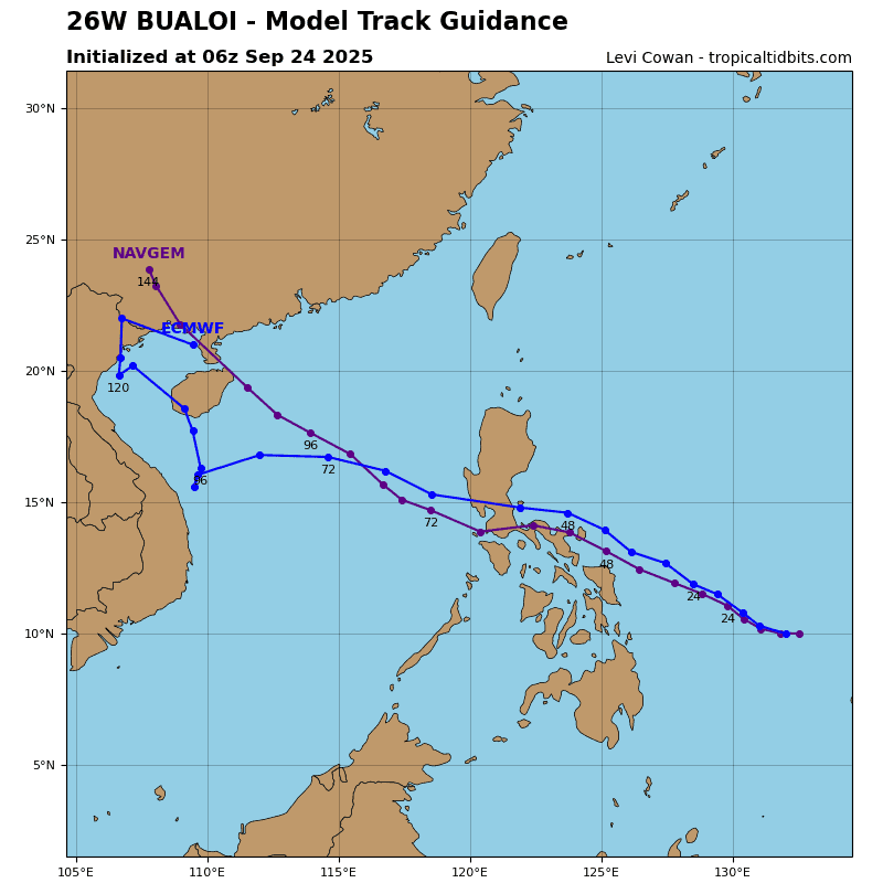 Around 36 hours, frictional effects from land passage, will further contribute to a brief weakening trend. After re-emerging over the South China Sea west of the Philippines, TS Bualoi is expected to resume intensification due to improved environmental conditions, particularly decreasing vws and warm ssts. The system is expected to reach peak intensity of 60-65 knots around 96 hours.