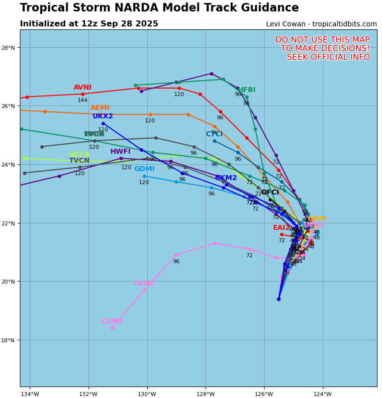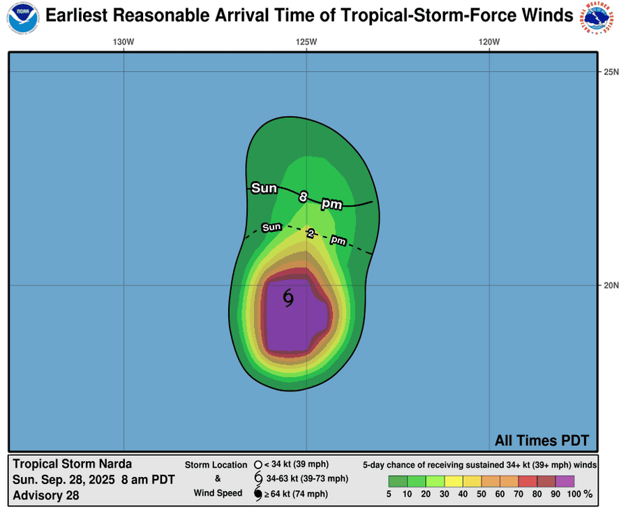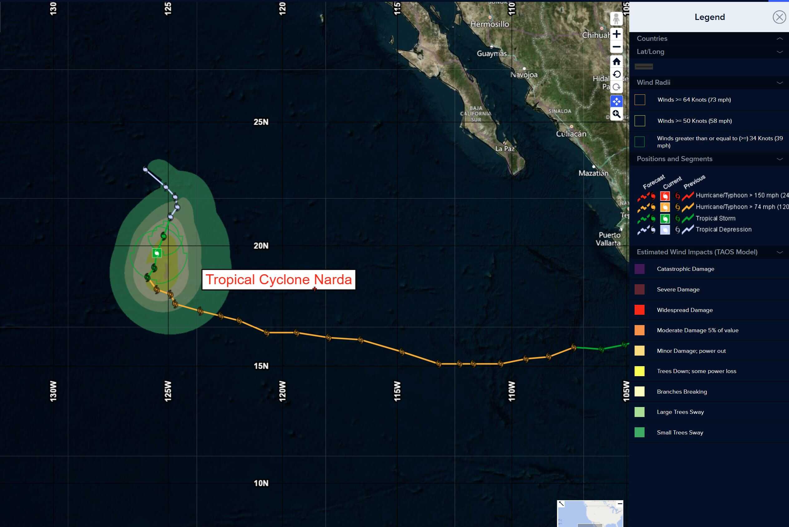 Surf: Swells generated by Narda are affecting portions of the coast of west-central Mexico, the Baja California peninsula, and southern California. These swells are likely to cause life-threatening surf and rip current conditions.