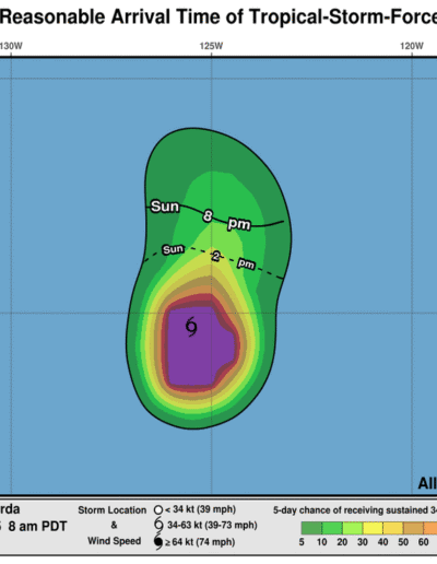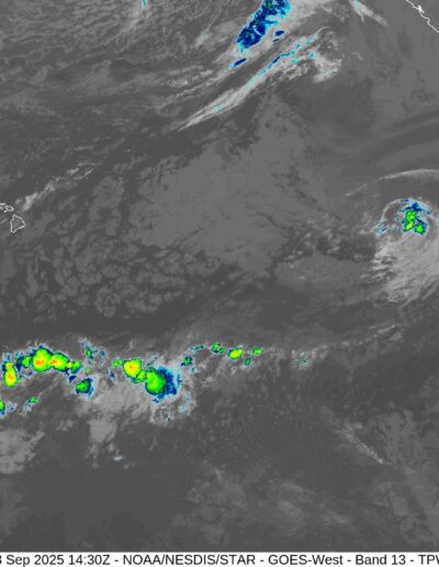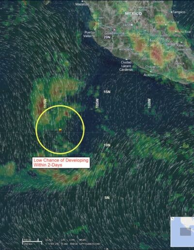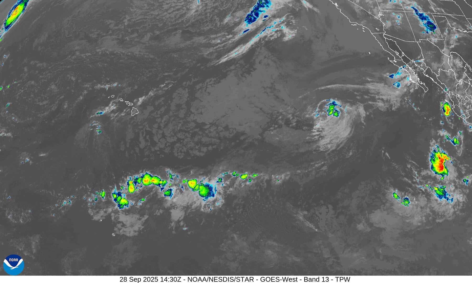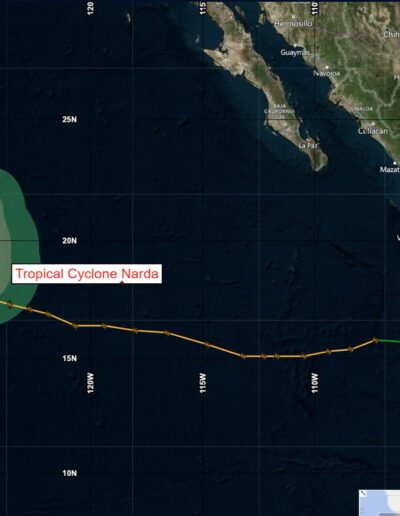Post-Tropical Cyclone 14E (Narda) is located approximately 985 NM west of the southern tip of Baja CA – Last Advisory