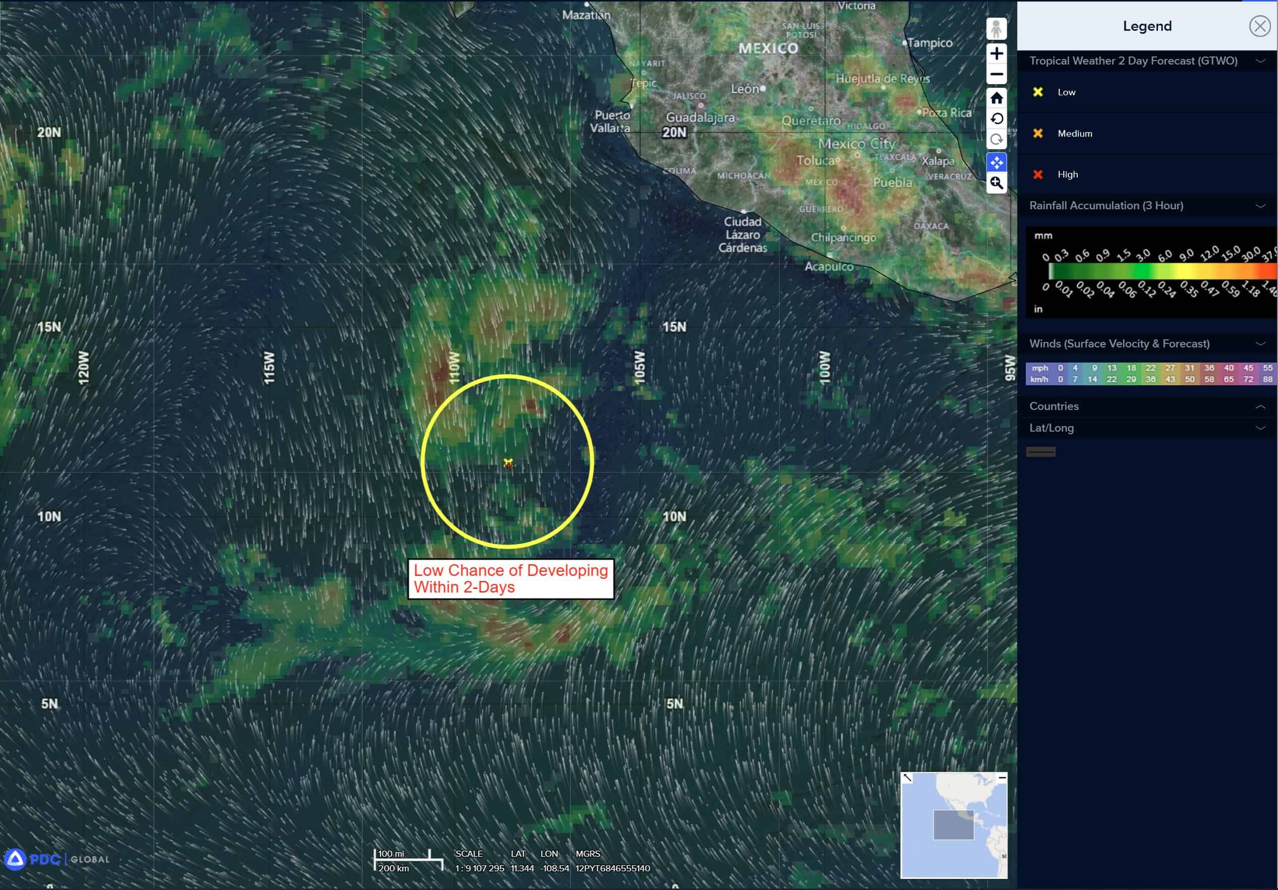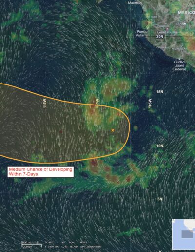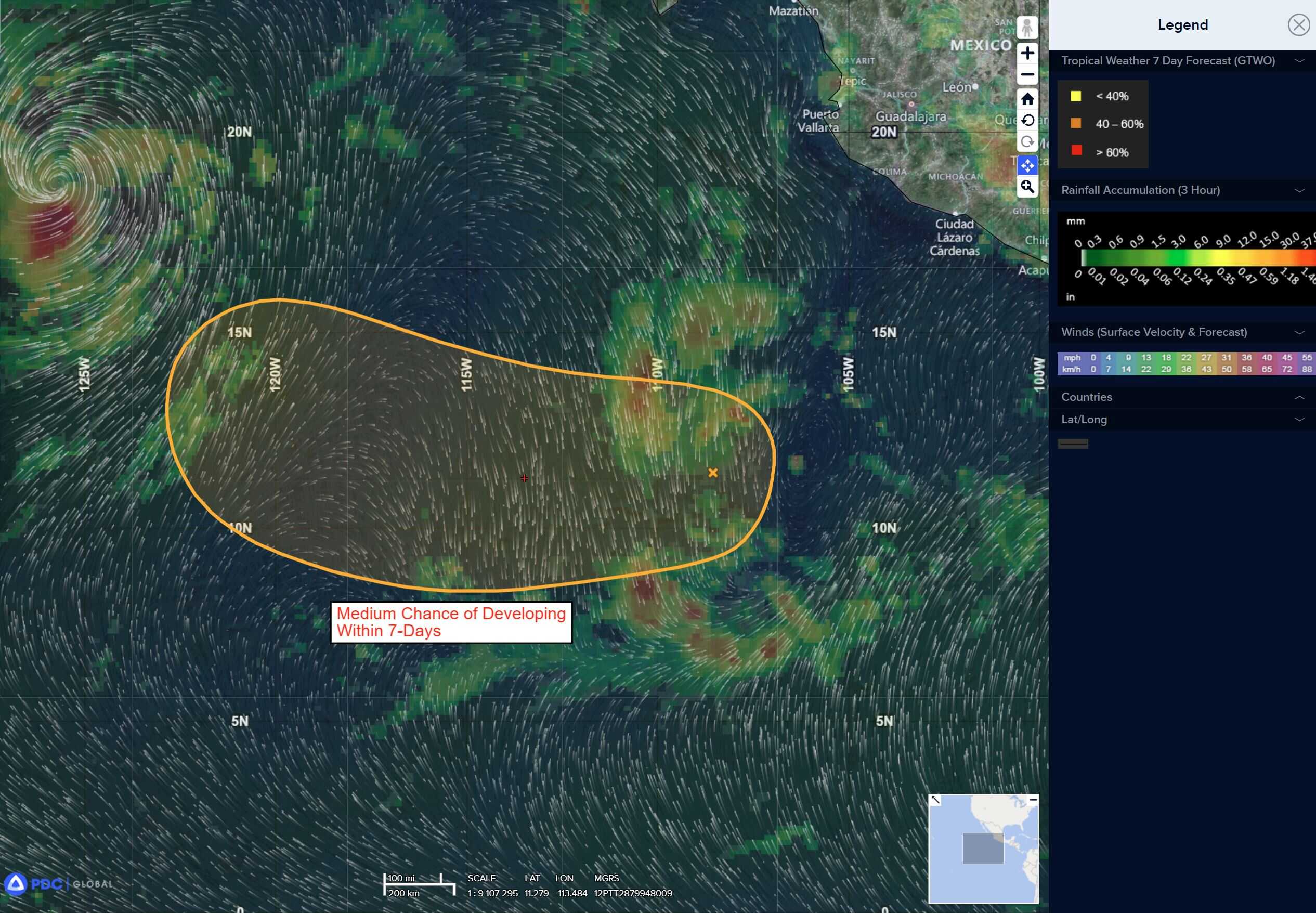 >>> A disorganized area of disturbed weather associated with a tropical wave is located several hundred miles offshore of southwest Mexico. Environmental conditions are expected to be conducive for gradual development of this system and a tropical depression could form around the middle portion of this week while the system moves generally westward around 10 mph.