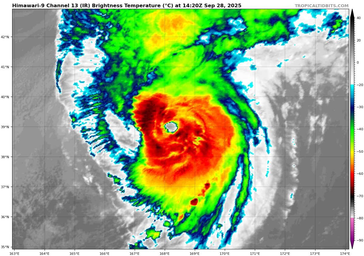 Typhoon 25W has put on an amazing show over the last couple of days, but it is time to turn off the lights, the party is over. Just in the last six to eight hours, the system has changed remarkably, going from a fully coupled vortex with a 20 NM wide eye, to a rapidly decoupling vortex and clear frontogenesis.