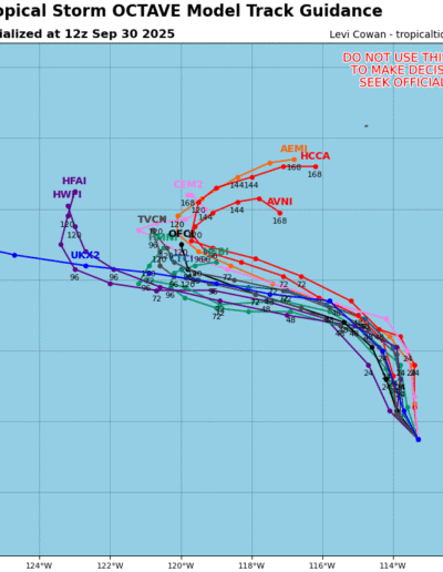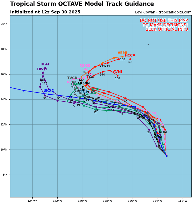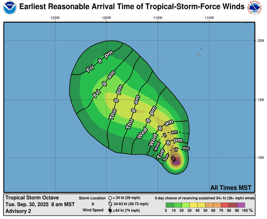 Octave is moving toward the north-northwest near 7 mph (11 km/h). This general motion is expected to continue for the next day or so, followed by a turn back toward the west-northwest Wednesday night into the weekend. Maximum sustained winds are near 45 mph (75 km/h) with higher gusts. Slight strengthening is forecast tonight followed by little change in strength during the next couple of days. Tropical-storm-force winds extend outward up to 45 miles (75 km) from the center. The estimated minimum central pressure is 1001 mb (29.56 inches).