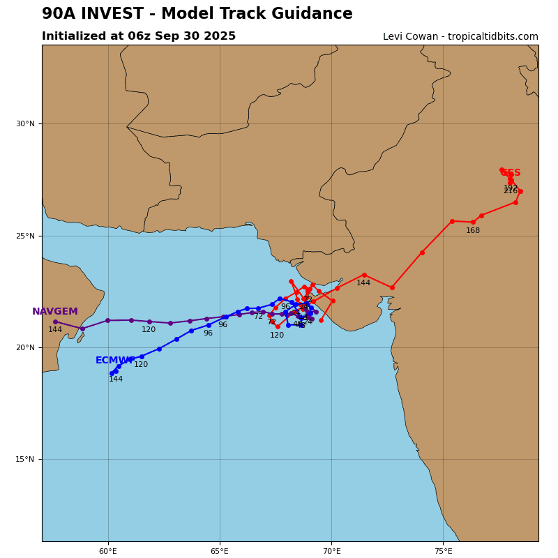 Deterministic and ensemble models are in good agreement with ECMWF being the sole outlier, portraying 90A to maintain its position over land as it tracks northwest toward Karachi, Pakistan over the next 24-48 hours.