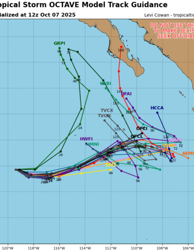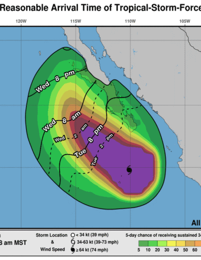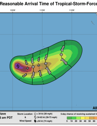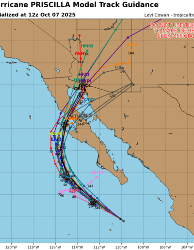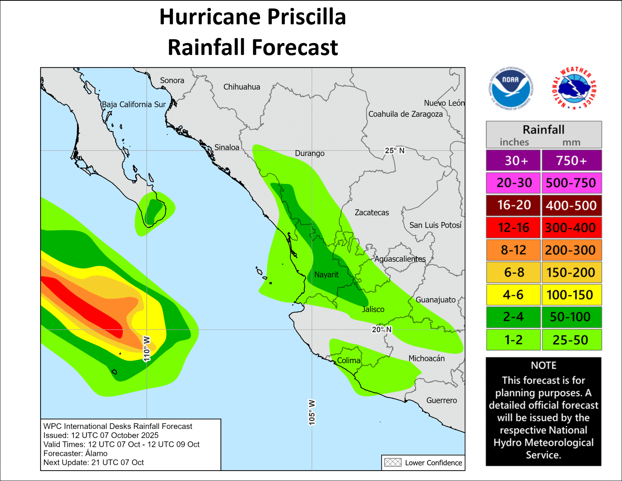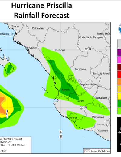 RAINFALL: From today into Wednesday, 1 to 2 inches of rain are expected in southern Baja California Sur, with local storm totals up to 4 inches as the outer bands of Priscilla reach the area. This rainfall could bring a risk of flash flooding, especially in areas of higher terrain. Moisture from Priscilla should bring 1 to 2 inches of rain, with local amounts to 4 inches, to portions of west-central Mexico, which could lead to flash flooding within the area’s terrain. From late this week into this weekend, moisture from Priscilla leads to heavy rainfall and a flash flood risk over portions of the U.S. Desert Southwest.