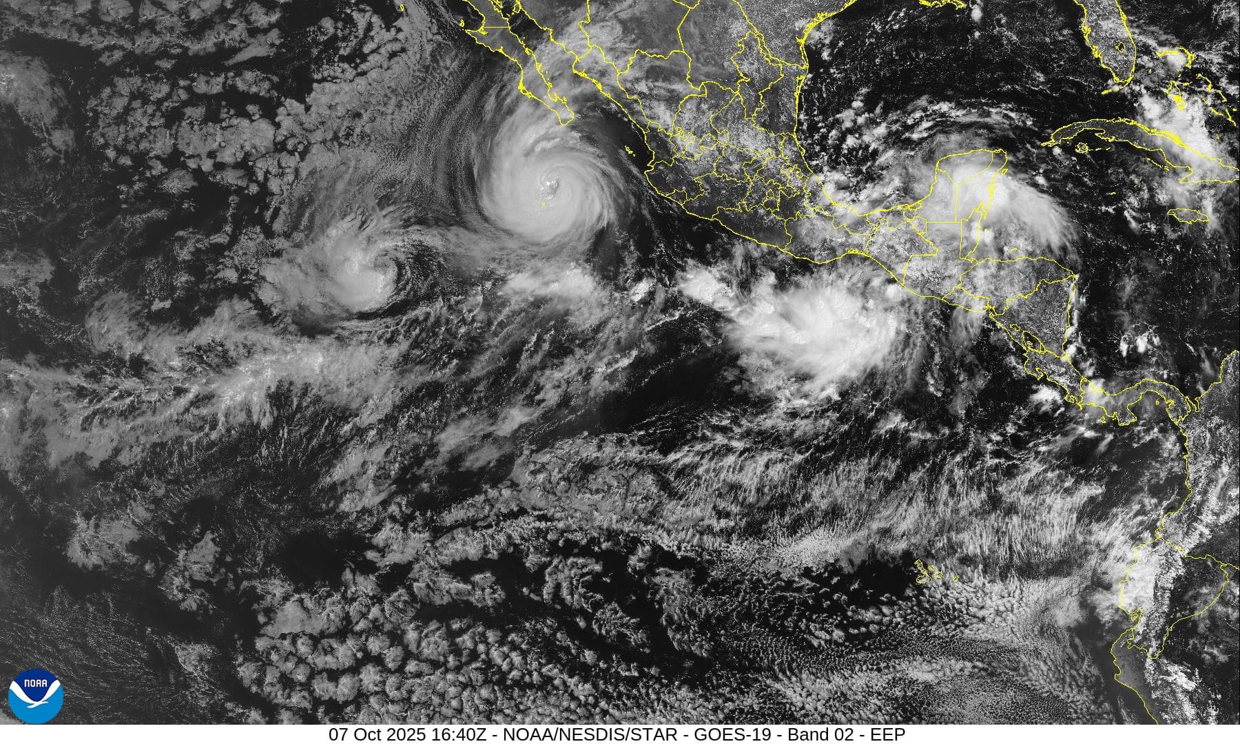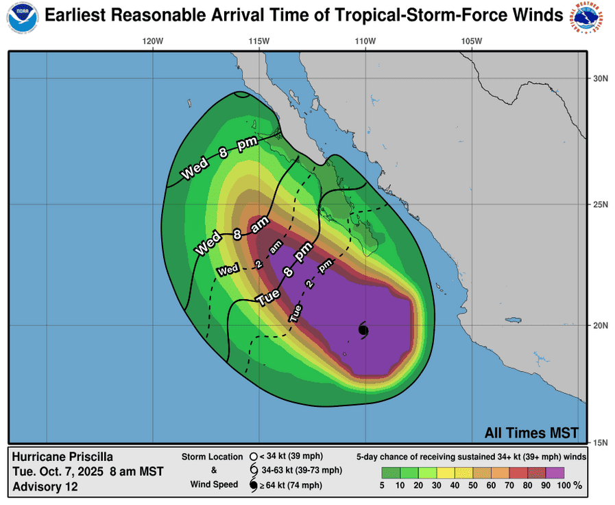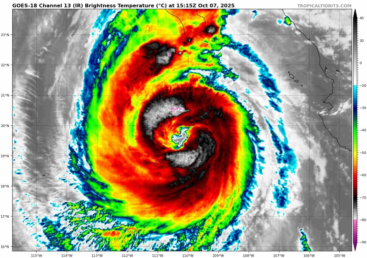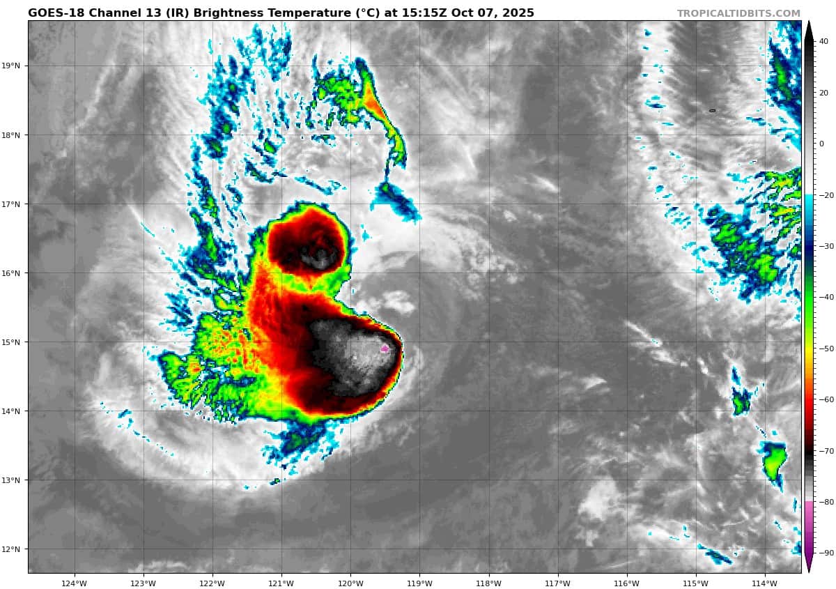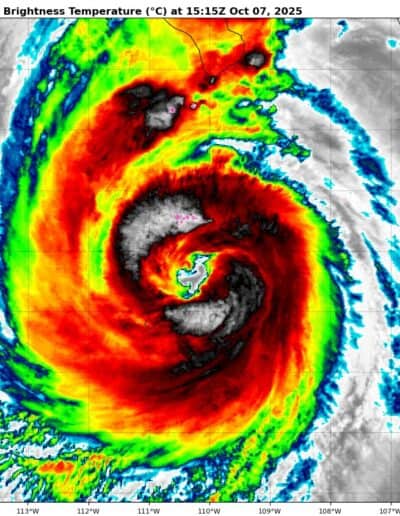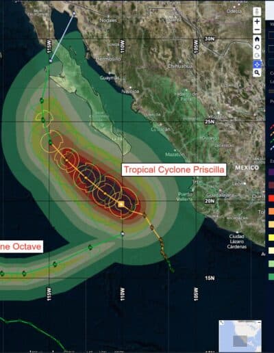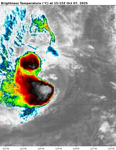 Hurricane-force winds extend outward up to 50 miles (85 km) from the center and tropical-storm-force winds extend outward up to 185 miles (295 km). Socorro island, located about 80 miles (130 km) southwest of Priscilla’s eye, recently reported a sustained wind of 52 mph (84 km/h) with a gust of 75 mph (120 km/h). The estimated minimum central pressure is 959 mb (28.32 inches).