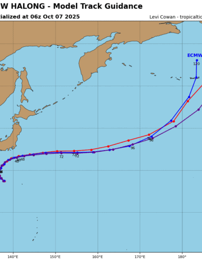 Following 24 hours the system is forecast to encounter cooler waters, higher wind shear, and relatively dry air entraining the core of the vortex – conditions that will cause a weakening trend and signal the beginning of a simultenous transition into an extratropical system.