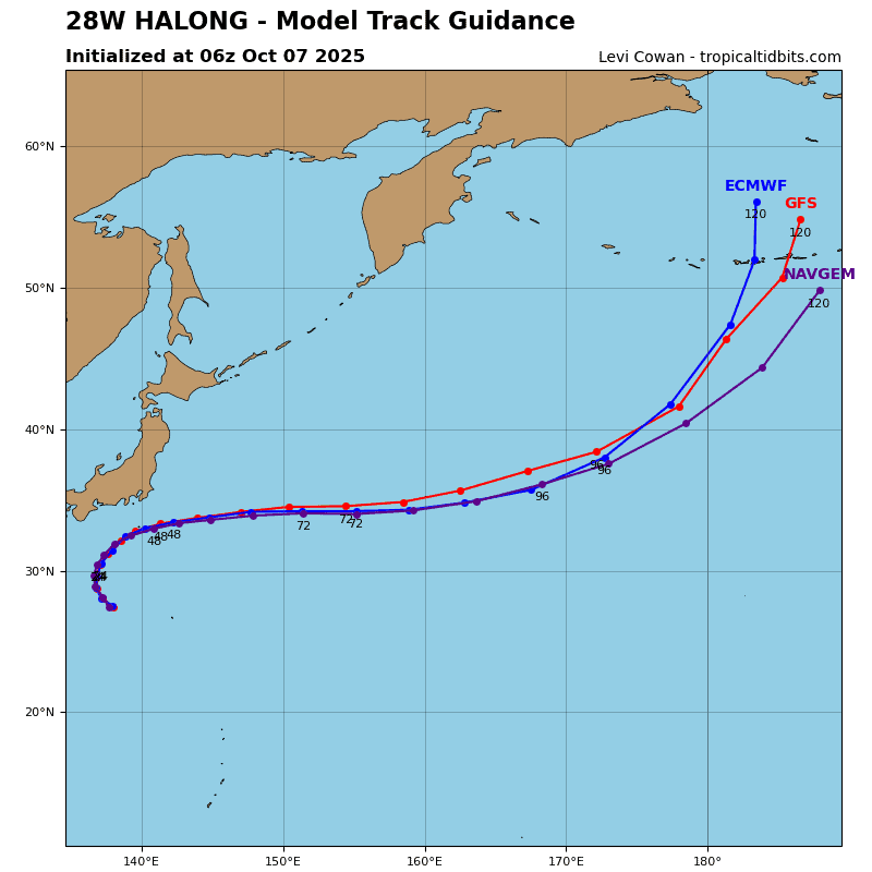 As TY Halong continues to transit northeast, unfavorable conditions will cause a more dramatic decline of the system. Maximum wind speeds are expected to weaken to 50 knots by 96 hours as the system will have completed its extra-tropical transition.