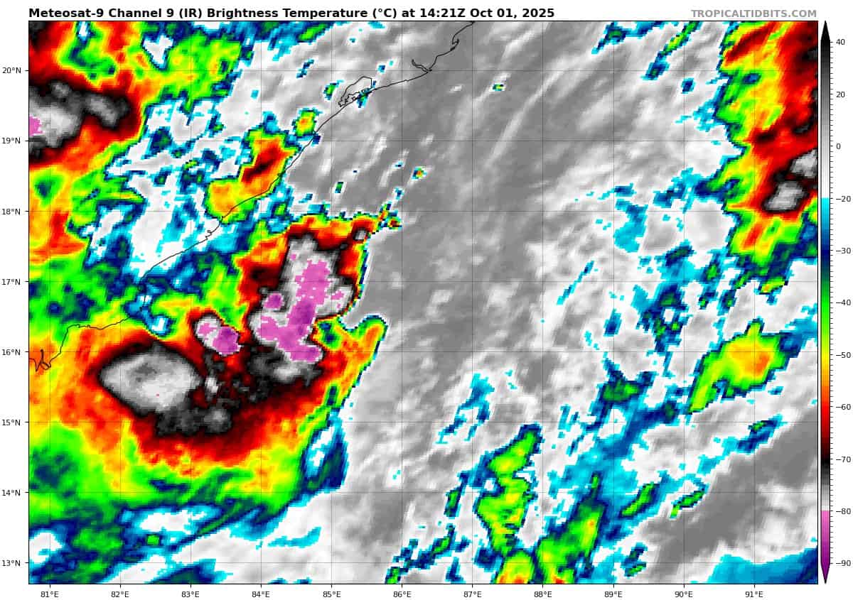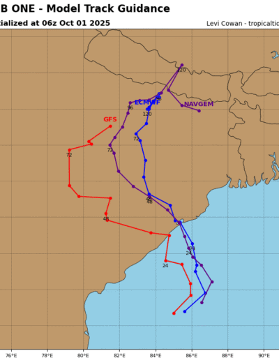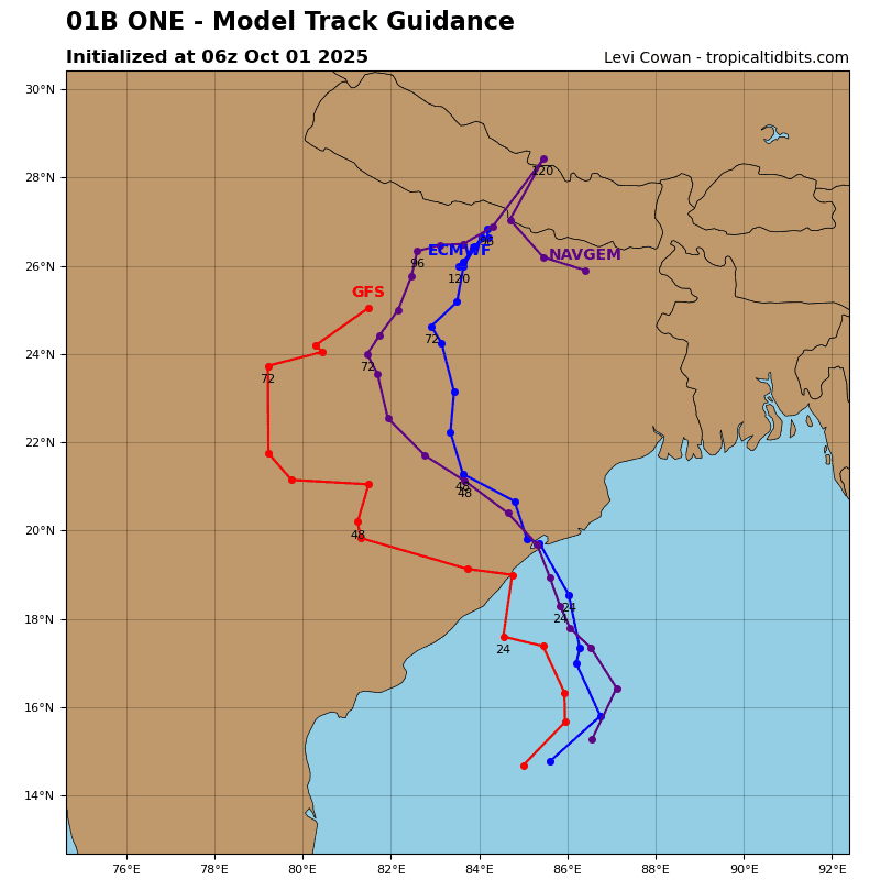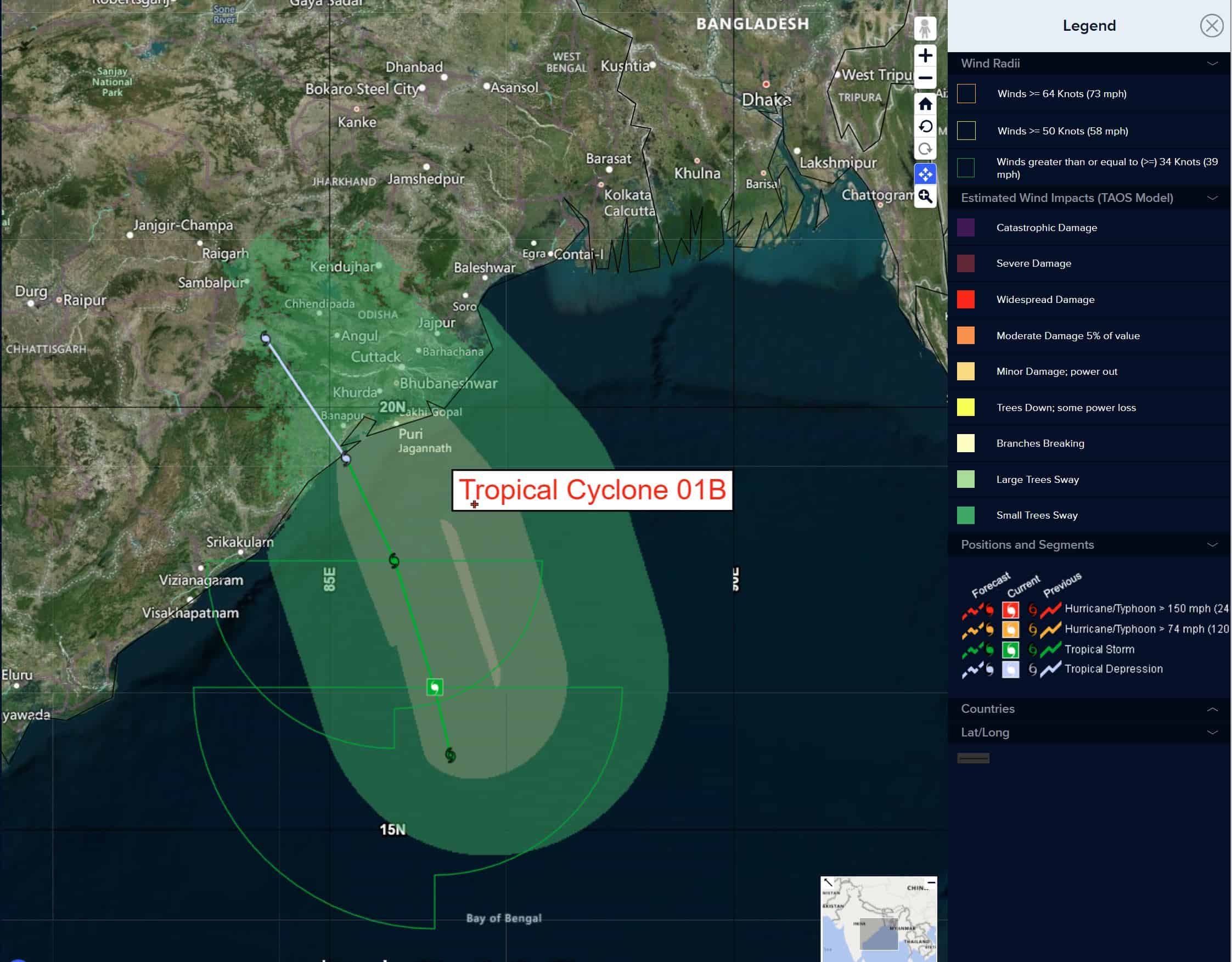 The upstream environment between the system and the coast is moderately more favorable. Current steering mechanism: a mid and upper level extension over the eastern Bay of Bengal is forcing the system towards the Indian coast.Tropical cyclone 01B will track through an area of slightly warmer waters and lower wind shear to the north, keeping the system viable through landfall. It is expected to come ashore south of Brahmapur, near Palasa. Wind fields will remain unbalanced, with no gale force easterlies likely over the poleward semicircle.