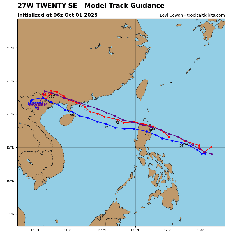 27W is forecast to track west-northwestward, under the influence of the building subtropical ridge to the north throughout the entire forecast period. An initial landfall is currently forecast to occur between 36 and 48 hours, along the southeastern portion of the Cagayan Province. A second landfall is then forecast to occur around 96 hours, near the Leizhou Peninsula.