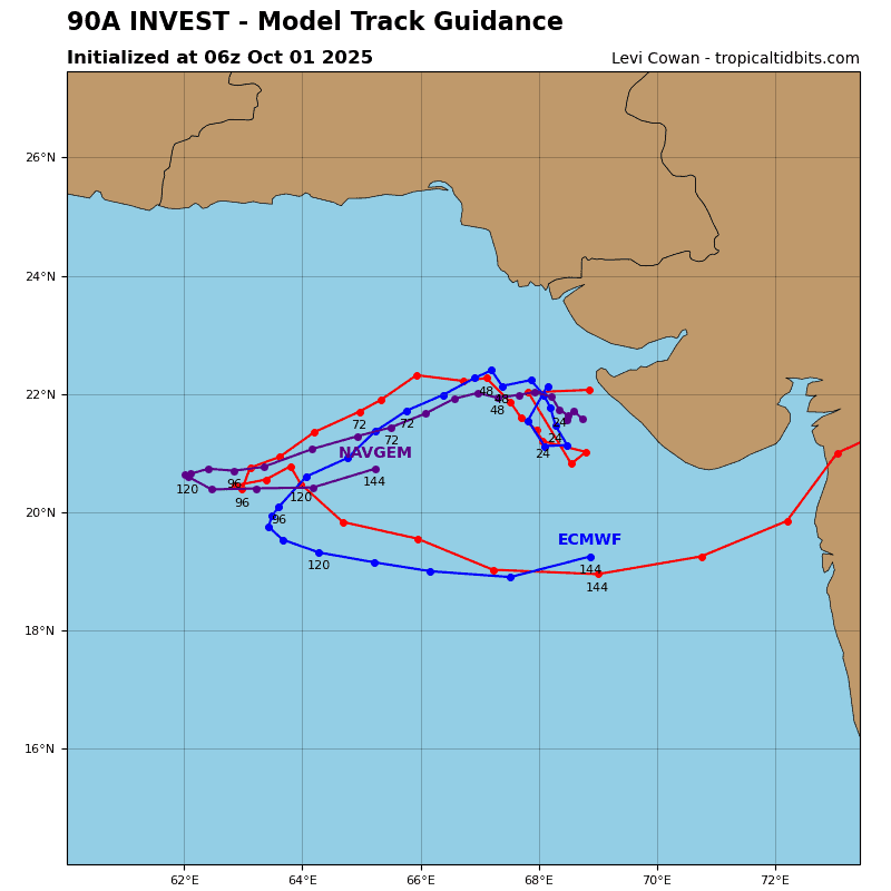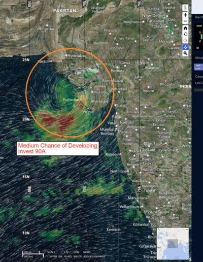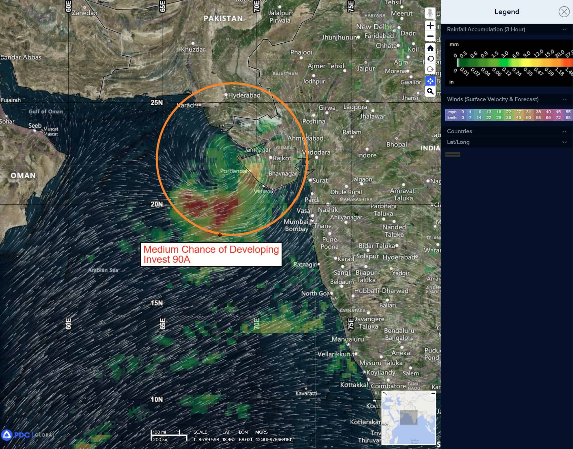 >>> There’s an area of disturbed weather being referred to as Invest 90A, which is located approximately 195 NM south-southeast of Karachi