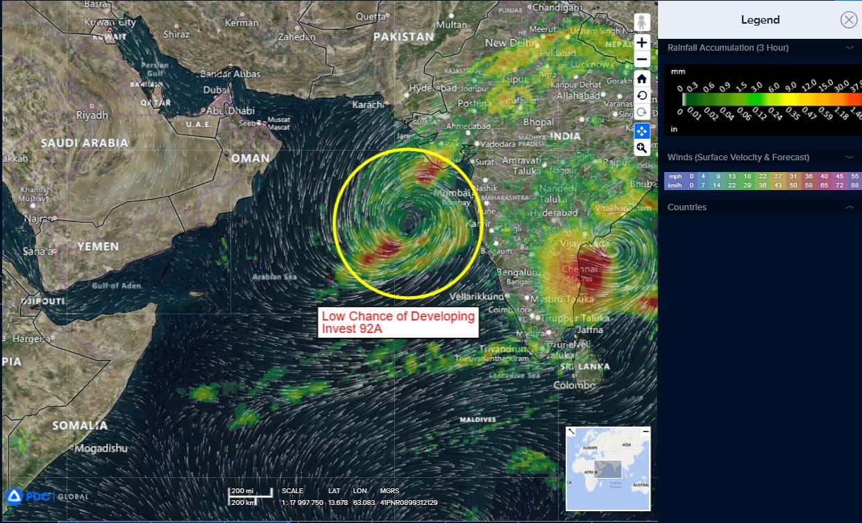 >>> There’s an area of disturbed weather being referred to as Invest 92A…which is located approximately 335 NM west-southwest of Mumbai, India