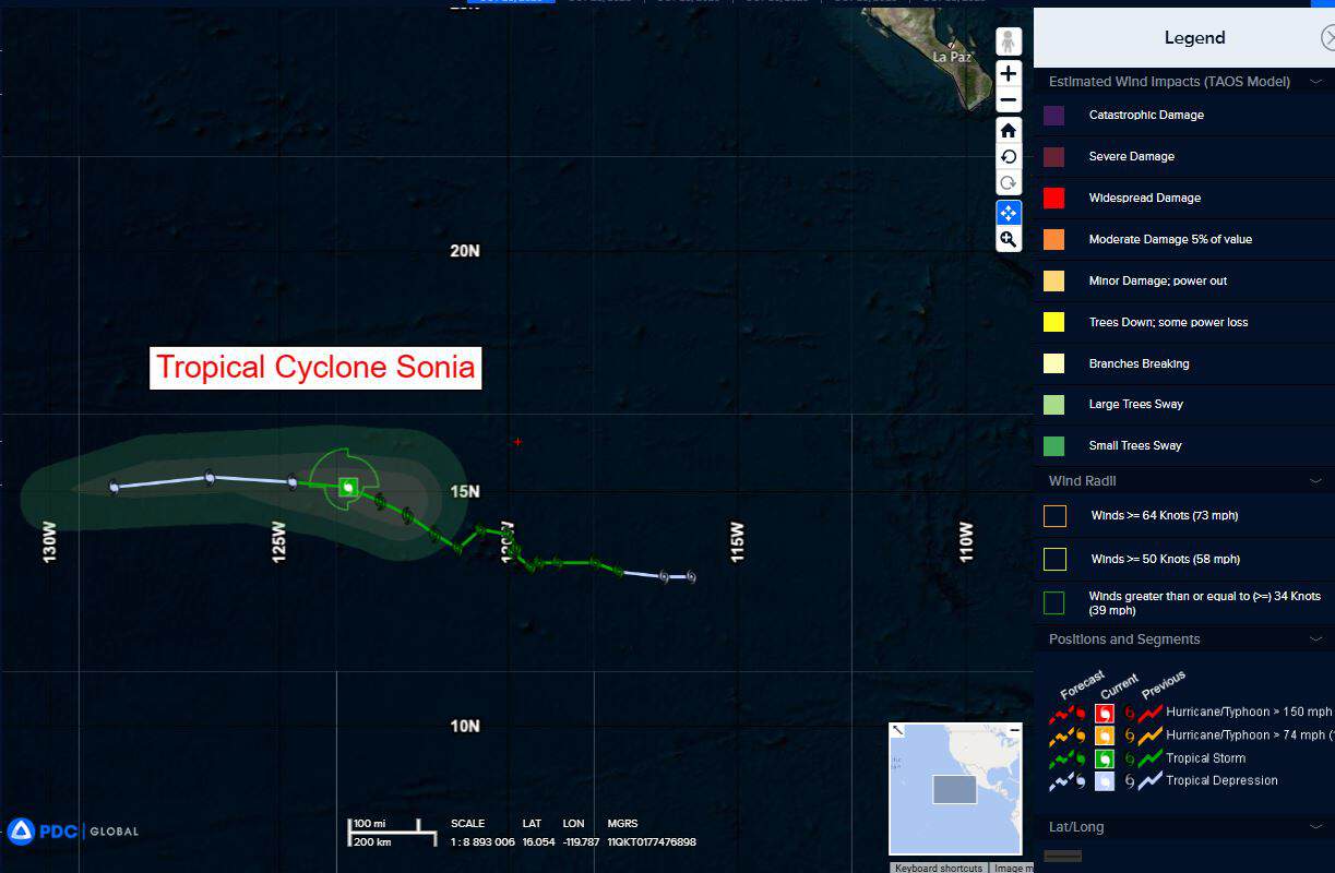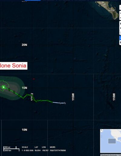 Tropical Cyclone 18E (Sonia)…is located approximately 1075 miles west-southwest of the southern tip of Baja California