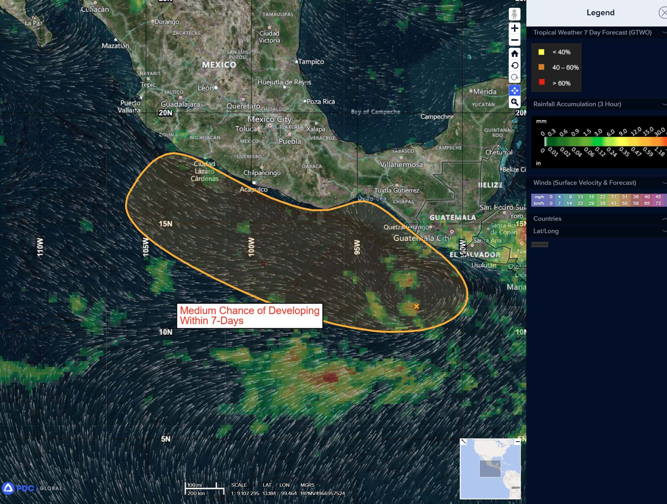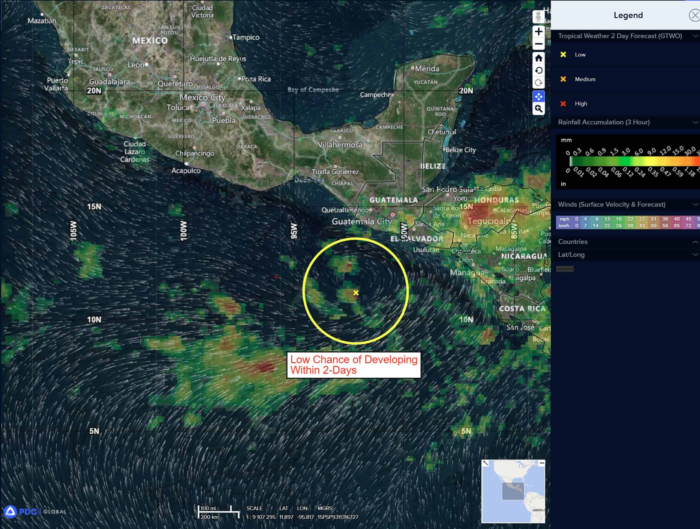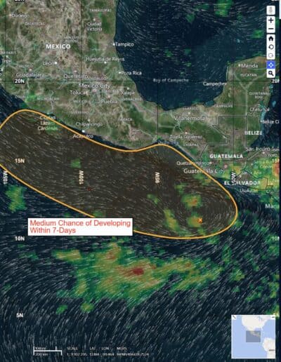 >>> A broad trough of low pressure located a couple hundred miles south-southwest of Guatemala is producing disorganized showers and thunderstorms. Little development is expected during the next few days while the system meanders well offshore. Towards the end of the week, environmental conditions appear more conducive for development, and a tropical depression could form while the system drifts northward then northwestward near or just offshore of the coast of southern Mexico.