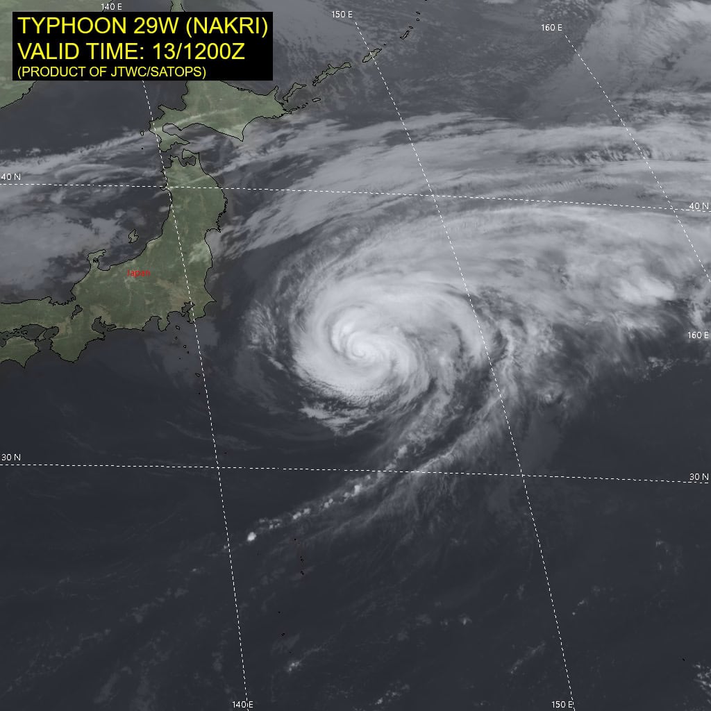 Extratropical transition (ett) will commence around 24 hours. though the forecast environmental setup suggests that the system could complete the ett cycle soon after 36 hours, the JTWC forecast maintains that TY Nakri will become fully extratropical at or prior to 48 hours, at an intensity of around 35 knots.