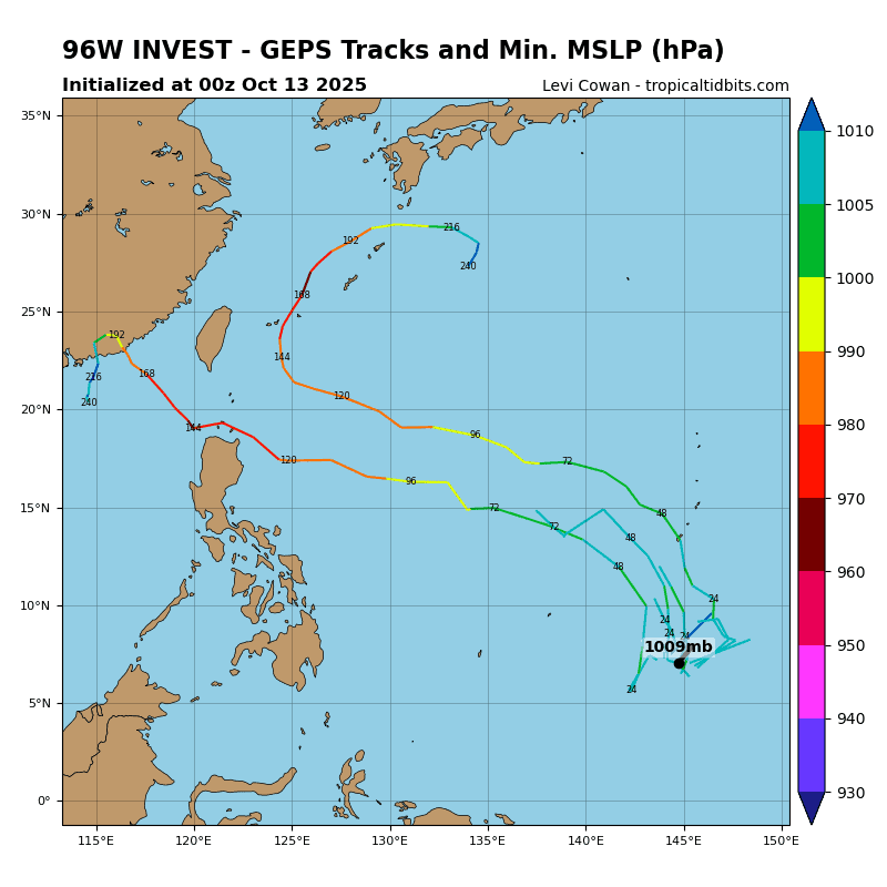 Deterministic and ensemble models are in good agreement that the area of convection (96W) will develop along a north-westward track with gradual intensification over time, with the exception of ECMWF which lacks development until the system approaches the northern tip of Luzon.