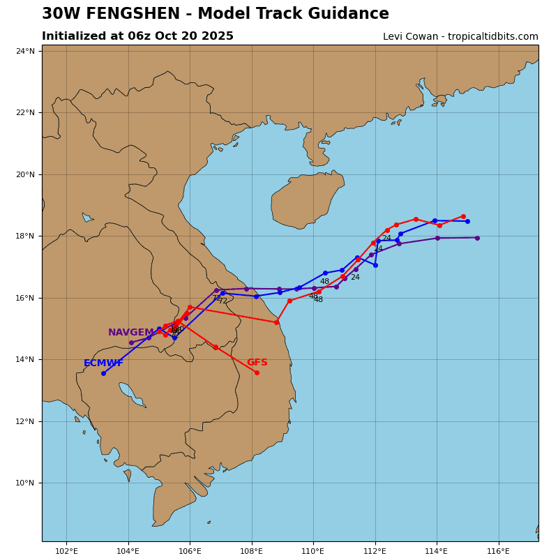 between the storm and the Chinese coast. After briefly slowing down as it runs into the northeasterly flow, TS 30W will accelerate southwestward towards the Vietnamese coast, where it is expected to make landfall in the vicinity of Da Nang around 60 hours.