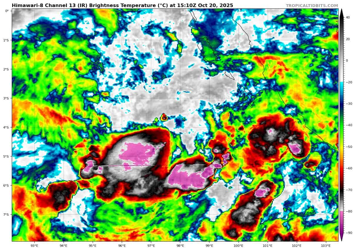 An ascat-b 200230z pass reveals a small, but well-defined, symmetrical llcc with 25 knot winds wrapping around the majority of the circulation, with the highest winds present in the northeastern sector, trapped along the island offshore of western Sumatra.