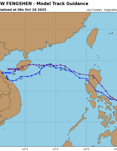 After making landfall, the system will quickly cross the island, pass through the Lingayen Gulf and emerge into the South China Sea. Once back over water, the system will continue to track northwestward at a good clip until 48 hours, when it will slam head first into strong northeasterly flow associated with a cold surge funneling southward out of the Taiwan Strait.