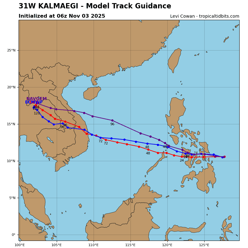 After making landfall in Leyte in the coming hours, 31W is forecast to gradually turn more northwestward as it rounds the southern periphery of the subtropical ridge to the north. 31W will then track across the Visayas and enter the northern Sulu Sea around 24 hours. The system will then traverse across the South China Sea and make a final landfall in Vietnam. This final landfall is forecast to occur just after 72 hours within central Vietnam.