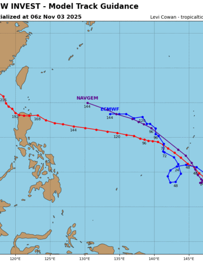 >>> There’s an area of disturbed weather that is being referred to as Invest 90W, which is located approximately 250 NM south of Guam