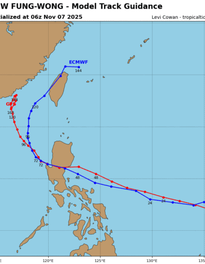 be centered over Hainan. A final landfall is expected to occur within southern Taiwan right around 120 hours.