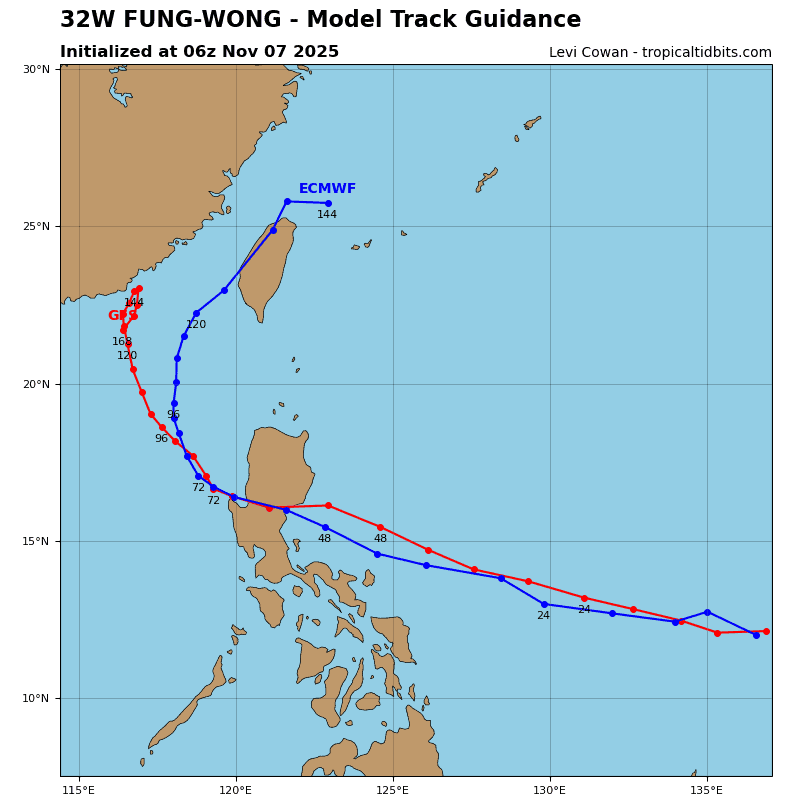 In terms of intensity, 32W is forecast to rapidly intensify through 36 hours to around 115 kts. The intensification trend will then halt as easterly shear begins to increase to around 25-30 kts. An intensity of 115 kts is currently forecast for the time of landfall in Luzon. After making landfall, the mountainous terrain will rapidly weaken the vortex.