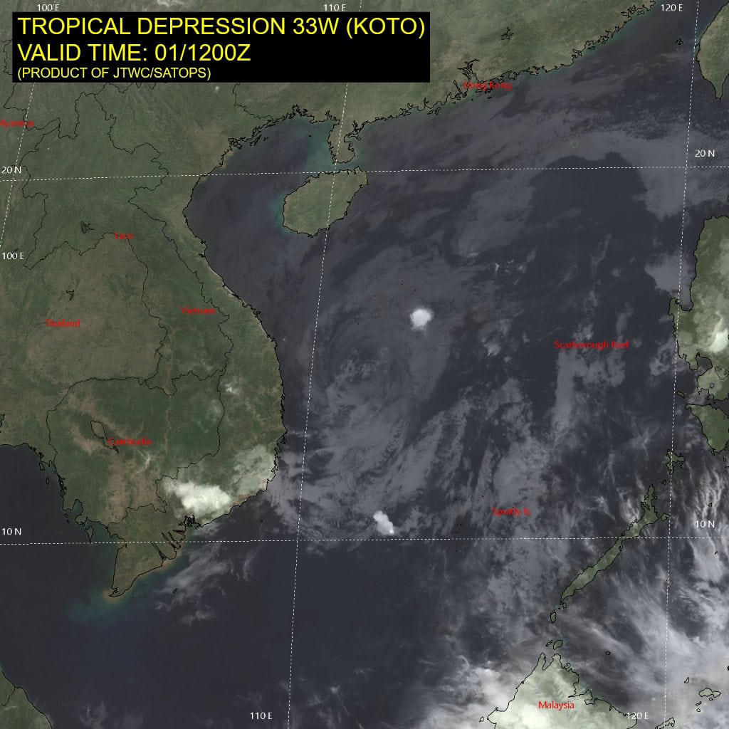 Tropical depression 33W (Koto) continues to track south-southwestward after a significant slowing of movement and a slight shift to the east. Convective activity around the circulation has ceased.