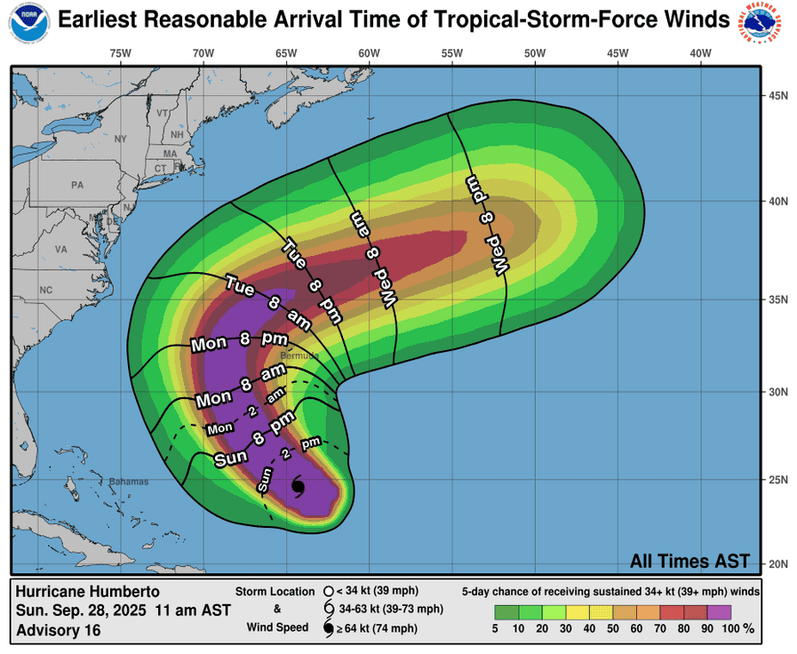 Humberto is moving toward the northwest near 14 mph (22 km/h). A gradual turn towards the north is expected over the next day or so. The hurricane is then forecast to turn and accelerate east-northeastward by late Tuesday or early Wednesday. On the forecast track, the center of Humberto will pass well west, and then north of Bermuda on Tuesday and Wednesday. Maximum sustained winds are near 140 mph (220 km/h) with higher gusts. Humberto is a category 4 hurricane on the Saffir-Simpson Hurricane Wind Scale. Fluctuations in intensity are possible during the next day or so. Gradual weakening is forecast after that, but Humberto is expected to remain a dangerous major hurricane for another couple of days. Hurricane-force winds extend outward up to 60 miles (95 km) from the center and tropical-storm-force winds extend outward up to 185 miles (295 km). The estimated minimum central pressure is 928 mb (27.41 inches).