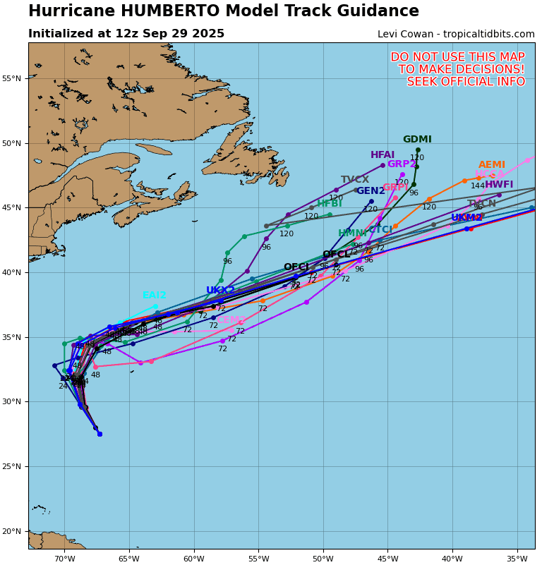 Humberto is moving toward the north-northwest near 13 mph (20 km/h). A gradual turn towards the north is expected over the next day or so. The hurricane is then forecast to turn and accelerate east-northeastward by late Tuesday or early Wednesday. On the forecast track, the center of Humberto will pass west, and then north of Bermuda on Tuesday and Wednesday.