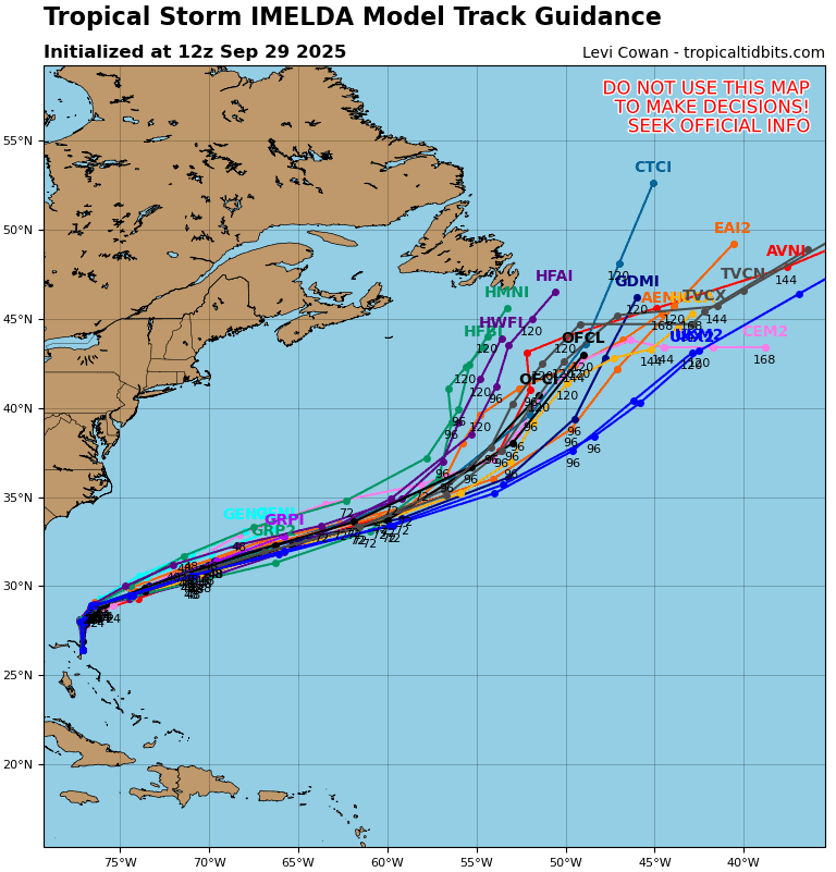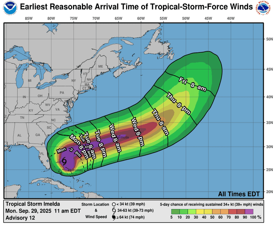 Imelda is moving toward the north near 9 mph (15 km/h), and a general northward motion is expected to continue tonight. On Tuesday, Imelda is expected to turn sharply to the east-northeast and accelerate. On the forecast track, the center of the system is expected to start moving away from the northwestern Bahamas this afternoon and then turn east-northeastward, moving away from the southeastern U.S. but approaching the island of Bermuda on Wednesday. Maximum sustained winds have increased to near 65 mph (100 km/h) with higher gusts. Additional strengthening is forecast over the next several days, and Imelda is forecast to become a hurricane on Tuesday morning. Tropical-storm-force winds extend outward up to 175 miles (280 km) from the center. The estimated minimum central pressure is 986 mb (29.12 inches).