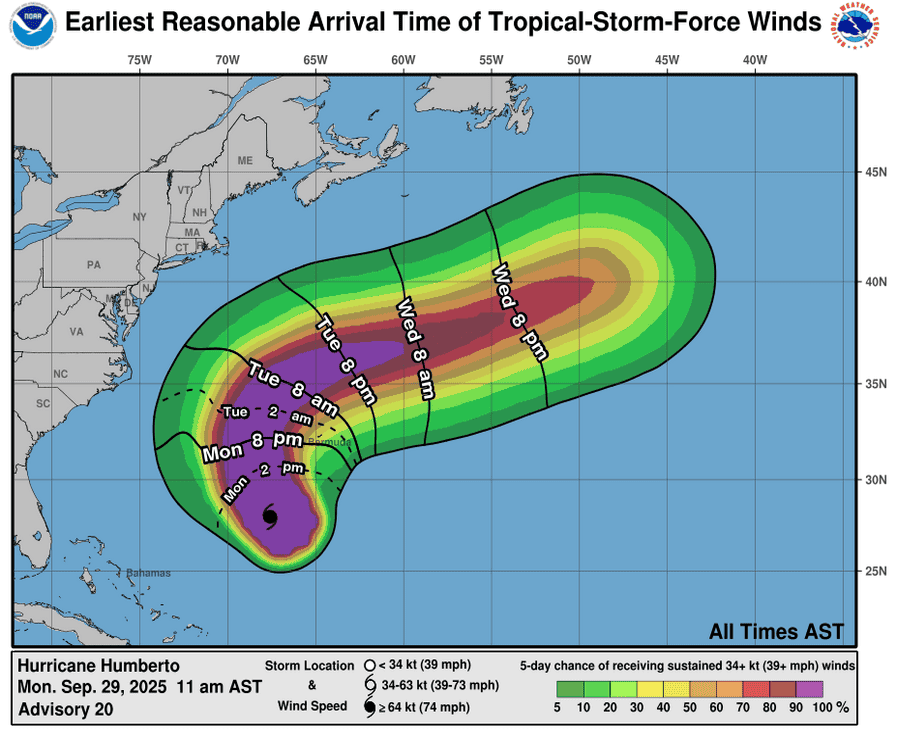 HUMBERTO PRODUCING DANGEROUS SURF AND RIP CURRENTS FOR BERMUDA AND MOST OF THE U.S. EAST COAST…GUSTY WINDS AND HEAVY RAINFALL FROM OUTER RAINBANDS ARE POSSIBLE ACROSS BERMUDA TUESDAY INTO WEDNESDAY