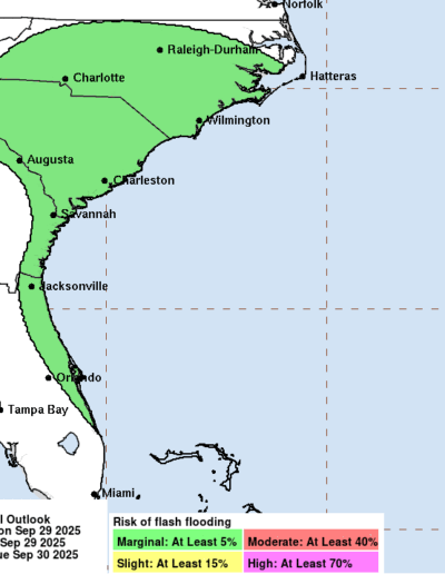 Storm total rainfall amounts of 1 to 2 inches with local maxima of 4 inches are expected through Tuesday across northeast Florida, coastal South Carolina, and coastal sections of southeast North Carolina. This rainfall could result in isolated flash and urban flooding.