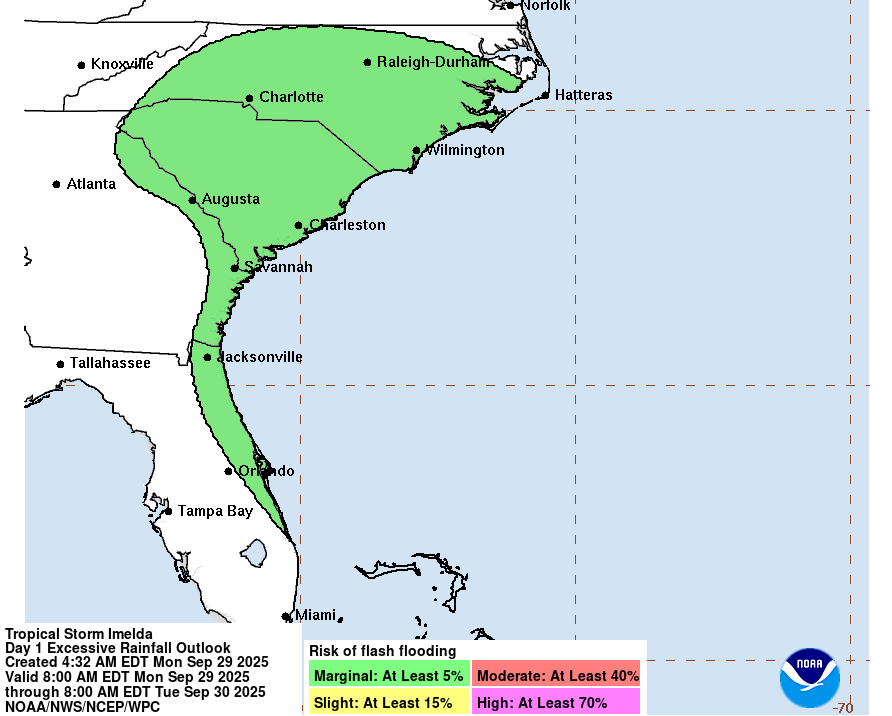 RAINFALL: Tropical Storm Imelda is expected to produce total rainfall of 4 to 8 inches across the northwest Bahamas through Tuesday. This rainfall will likely produce flash and urban flooding.